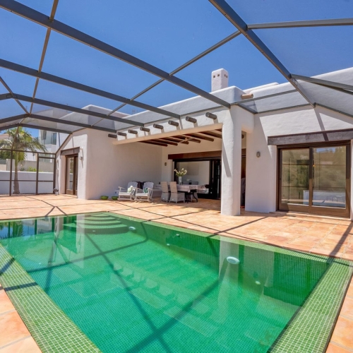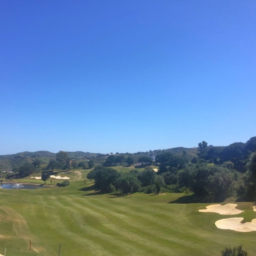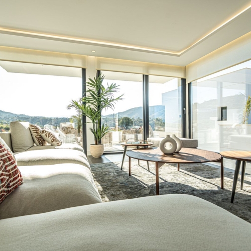 The open-plan living area connects to a modern kitchen and opens out to sunny terraces, a landscaped garden, and a private pool. On the rooftop, a large terrace provides panoramic views of the golf course and surrounding landscape — perfect for relaxing or entertaining.