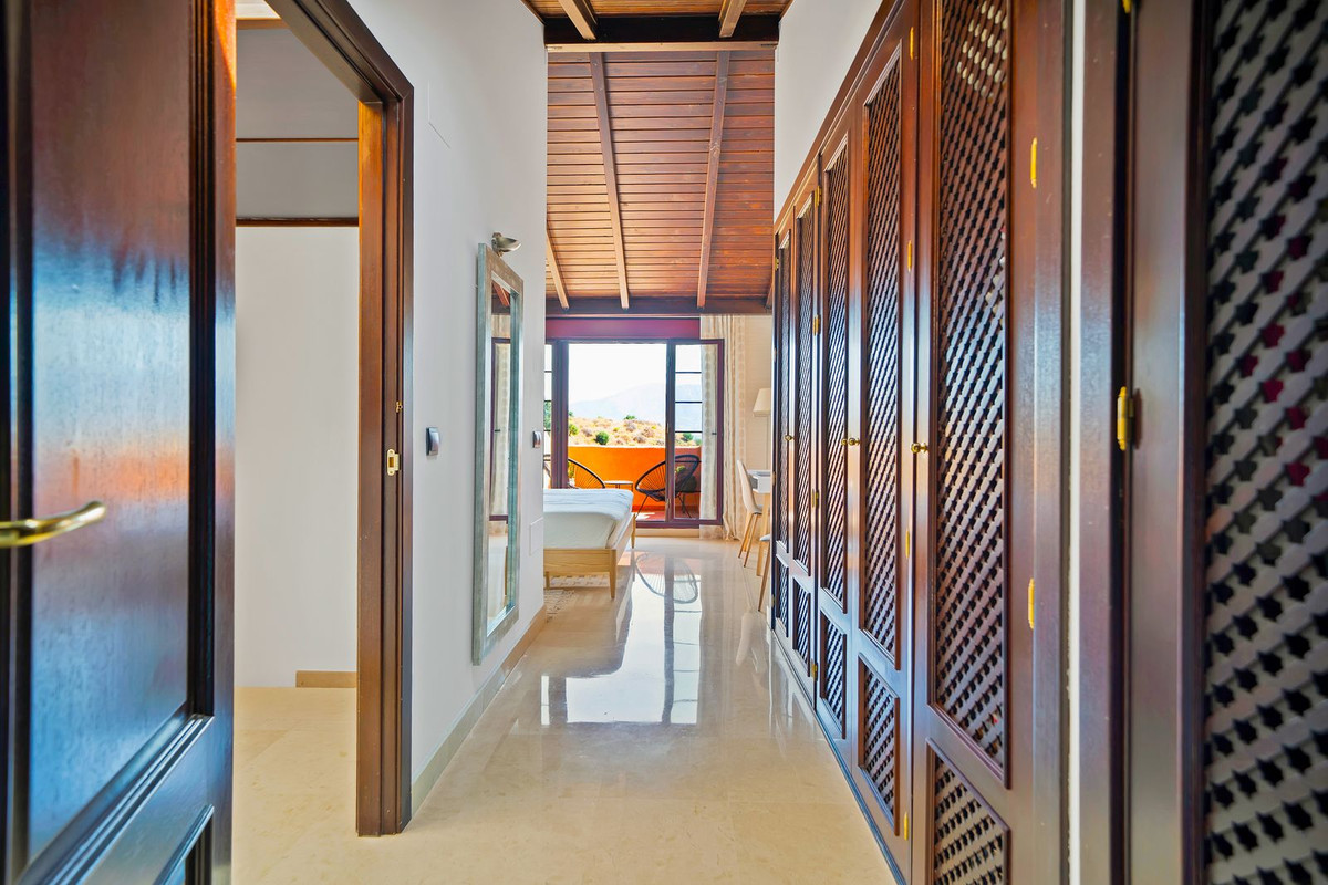 Heading through the open plan dining and living room, the double-height ceiling allows for an attractive staircase which leads to the upper level where a gorgeous master bedroom with pitched wooden roof, a generous dressing room area and a lovely high-quality bathroom with walk-in shower, large bath-tub and wash basin, and a separation between the main bathroom and the lavatory area. The pitched rooves on this level feature built in sky-light windows which bathe the rooms in daylight and give comfort of fresh air. The master bedroom benefits from privacy and also it´s own gorgeous terrace that faces eastwards with awesome views of the Mijas mountains. Excellent for watching the morning sunrise.