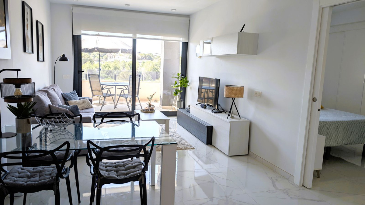 To cool off during the peak times of summer you have direct access to the communal pool, here in the gated complex you have green grass area, palm trees to offer shade. This modern apartment is located in a quiet and pleasant area, close to both the beach and the commercial centre. Perfect for those looking for a comfortable accommodation in Los Altos/Villamartin , with both relaxation and activity within easy reach. With Supermarket and restaurants/bars in Via Park CC, and only 3km to the beach of Punta Prima.