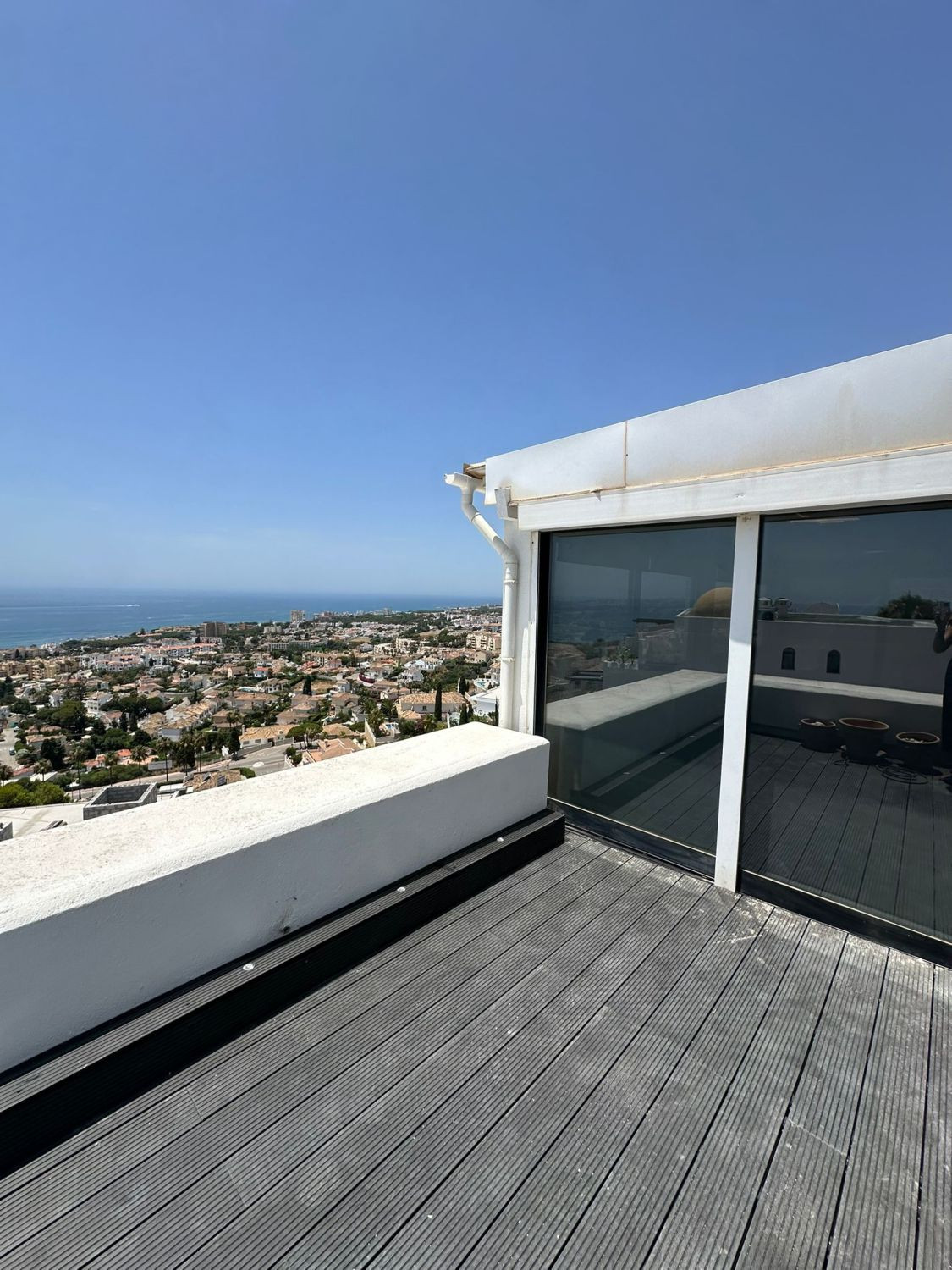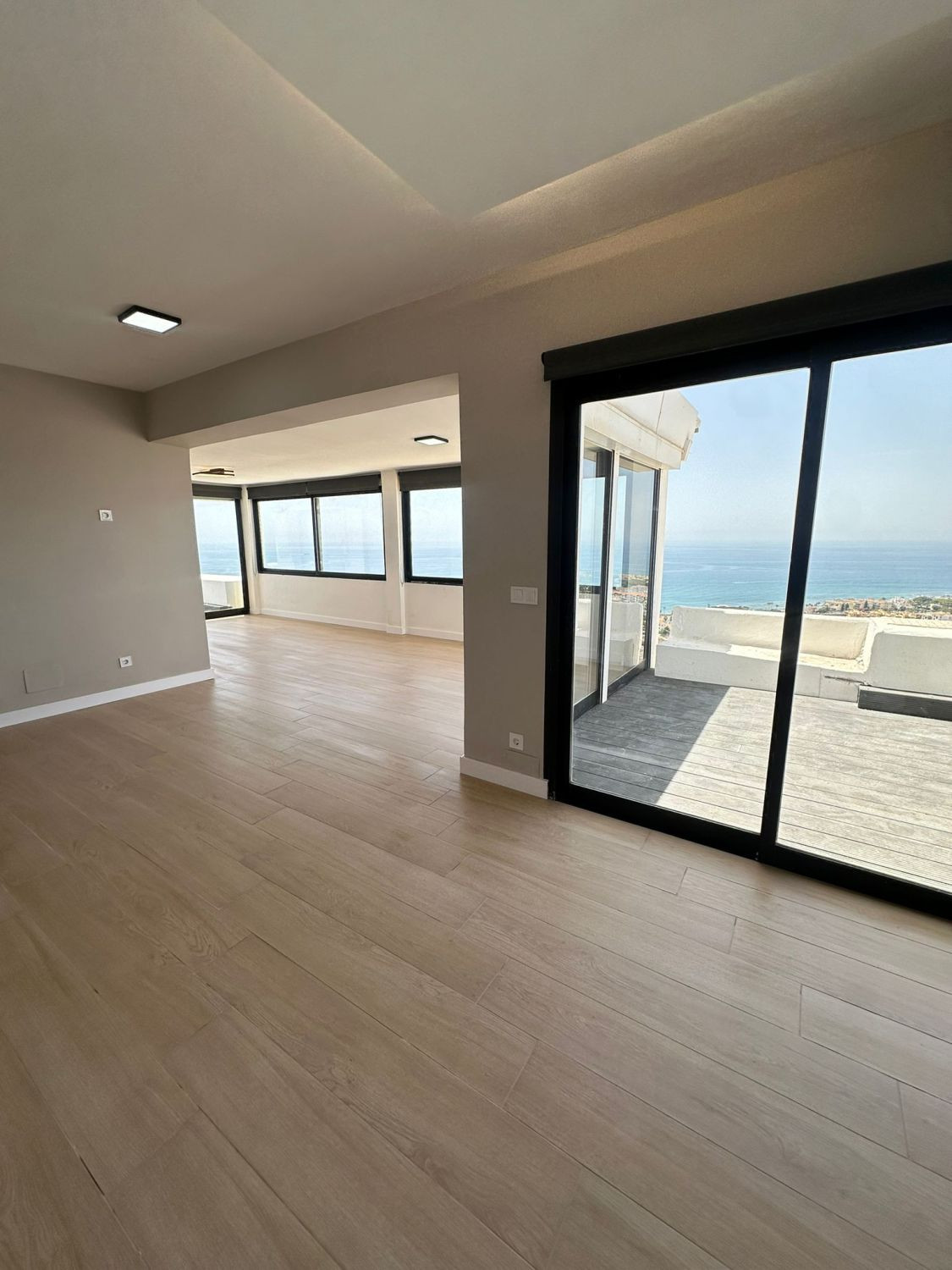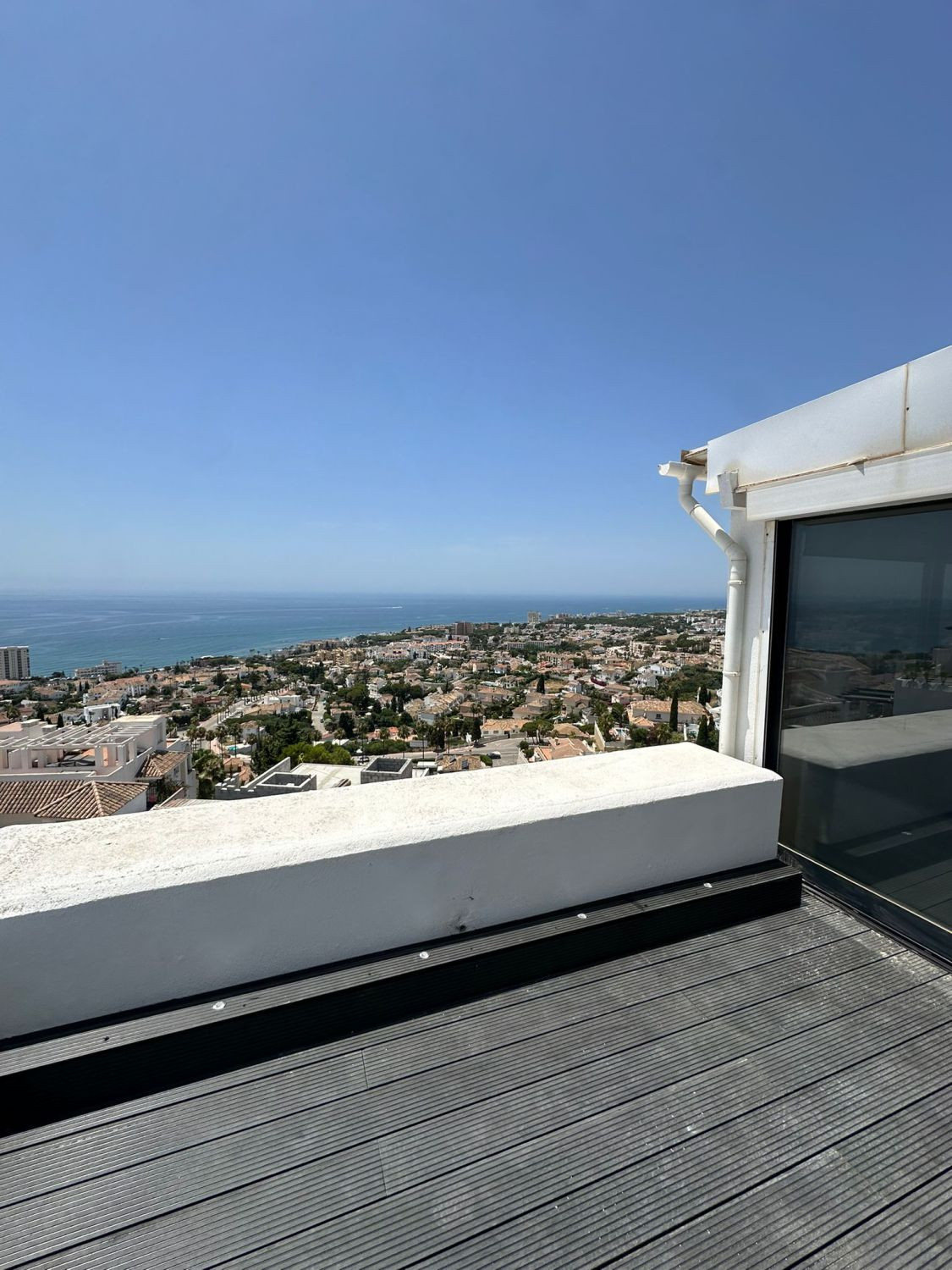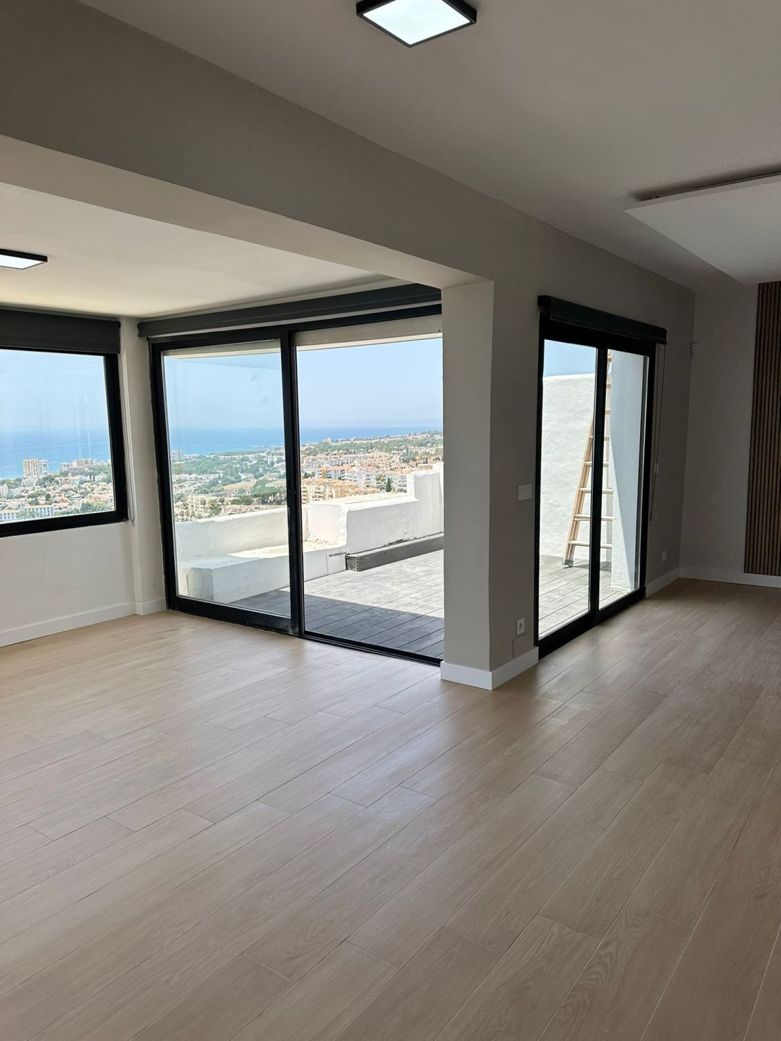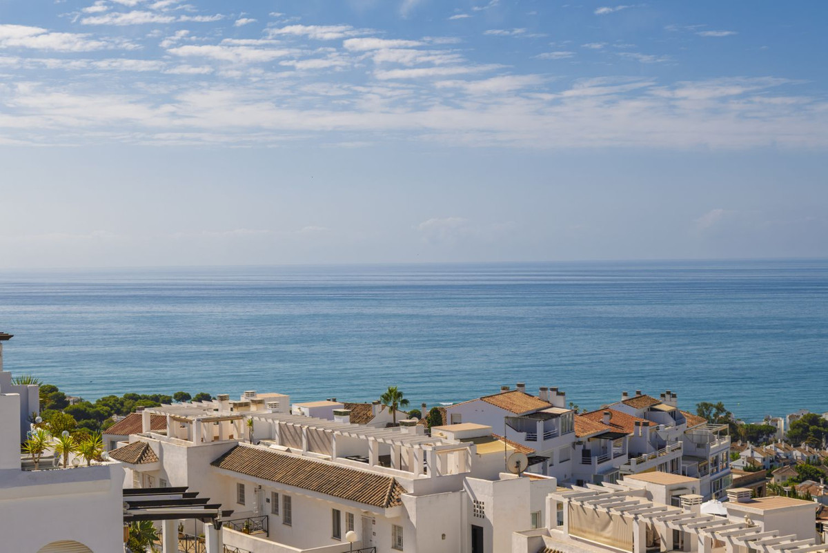 We offer this wonderful penthouse for sale in the coastal town of Mijas, province of Málaga. Located in a gated community with a communal pool and well-maintained landscaped areas, this apartment will make your stay a healthy experience, filling you with vitality and good humor. 17 km from the center of Málaga city, it will provide you with access to all the services and facilities you may need (shops, supermarkets, sports, educational, and health centers, public transportation, hospitality and catering services, government offices, and leisure facilities, such as the Miraflores Golf Course (1.7 km) or Torre Nueva Beach (2 km), among others. This wonderful home is located on a single floor and is located in the penthouse of a residential building. This first-floor apartment, with no elevator, occupies an exclusive wing of the floor, ensuring privacy as it is not shared with neighbors. It has a constructed area of 115 m², distributed among: 3 bedrooms with built-in wardrobes, a separate kitchen, two full bathrooms (one en suite), and a spacious living-dining room with access to a 22 m² terrace. This spacious area, which seems to divide the terrace in two, is located inside the living room. It features large windows and large glass doors, from which you can enjoy the beautiful 360º panoramic sea views in any season, regardless of the weather (it is sunny for most of the day). You can also spend unforgettable moments with your loved ones enjoying the beneficial Mediterranean climate on the terrace on summer nights.
