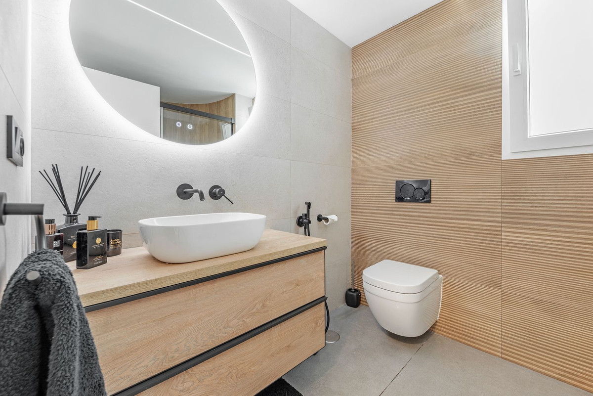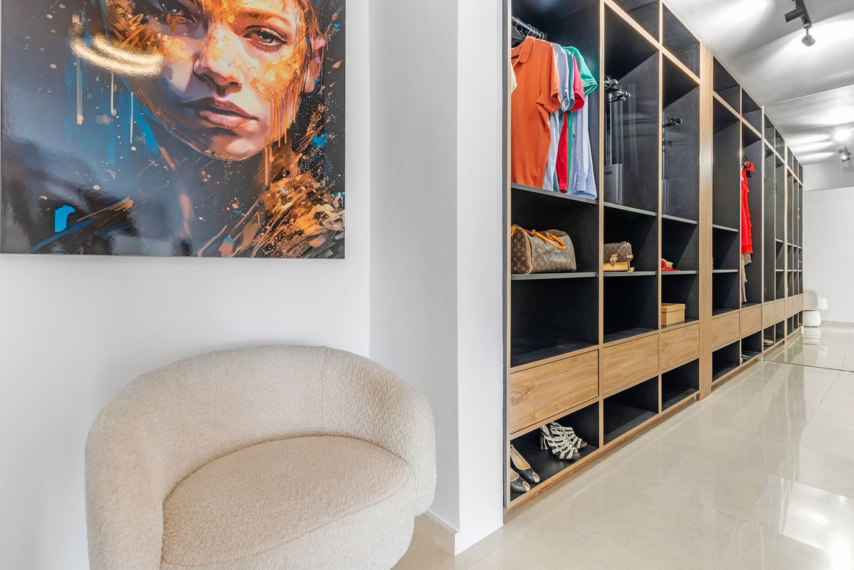 Distributed over three floors, the villa offers generous living spaces filled with natural light. The open-plan living room flows seamlessly into a state-of-the-art kitchen with an island, fully equipped with high-end appliances and designed for both style and functionality. Floor-to-ceiling windows open directly onto expansive terraces, creating a perfect harmony between indoor and outdoor living while framing the stunning sea and mountain views. The property includes several en-suite bedrooms, fitted wardrobes, air conditioning, and contemporary finishes of the highest quality.