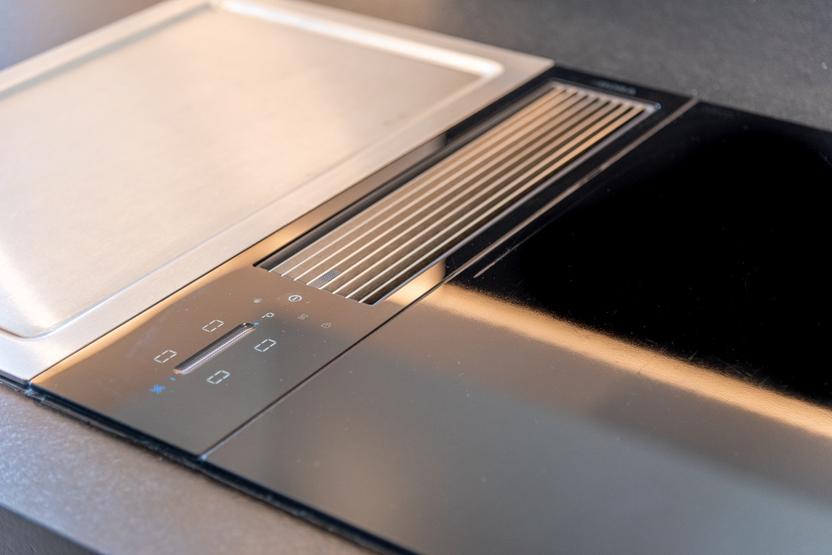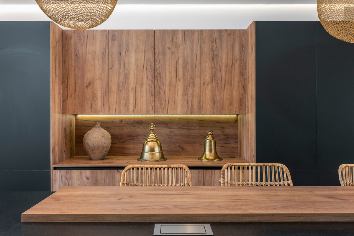 The home has a 45-square-meter living-dining room with a built-in fireplace, connected to a large 40-square-meter designer kitchen with a room for ironing and appliances. The kitchen has a 4-meter central island with a breakfast bar, an 80-bottle wine cellar, two hidden refrigerators with freezers, and Bora induction cooktops with a Teppanyaki grill and countertop extractor. There is plenty of storage, and all cabinets and drawers have LED interior lighting.