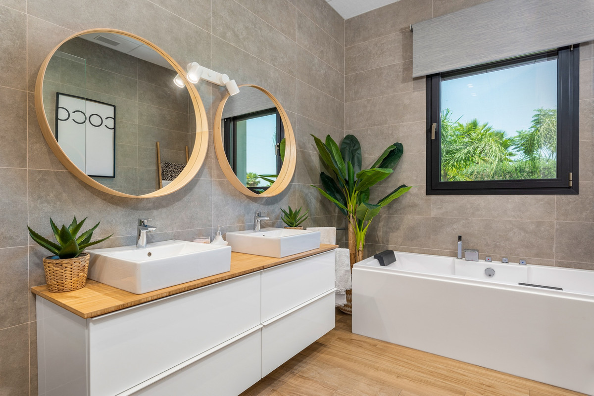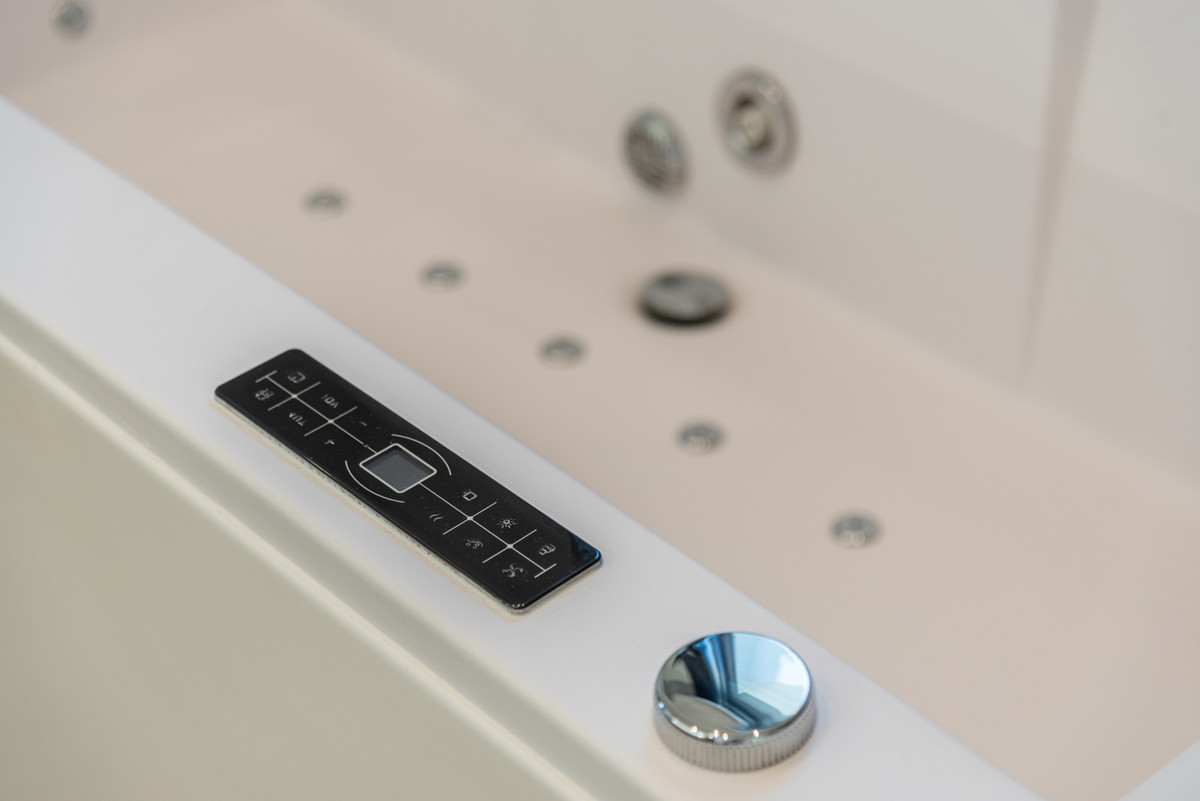 The home has 3 full bathrooms with showers, 1 guest bathroom in the living area, and 2 bathrooms with whirlpool tubs. All bathrooms have electronic showers with displays to control water temperature and pressure, rainfall showerheads, and underwater music systems with radio and Bluetooth. All 3 bathrooms have underfloor heating in the showers. The master bathroom has a large double shower with a seat.