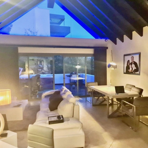 The living area exudes elegance and tranquility, with a separate dining room that is bathed in natural light and opens onto a spacious terrace. The distinct lounge area is equally impressive, featuring high ceilings, contemporary lighting, a cozy fireplace, and a welcoming, relaxed ambiance. Large sliding doors create a seamless connection between the indoor and outdoor spaces, framing breathtaking views of the Mediterranean Sea and the Los Flamingos golf course.