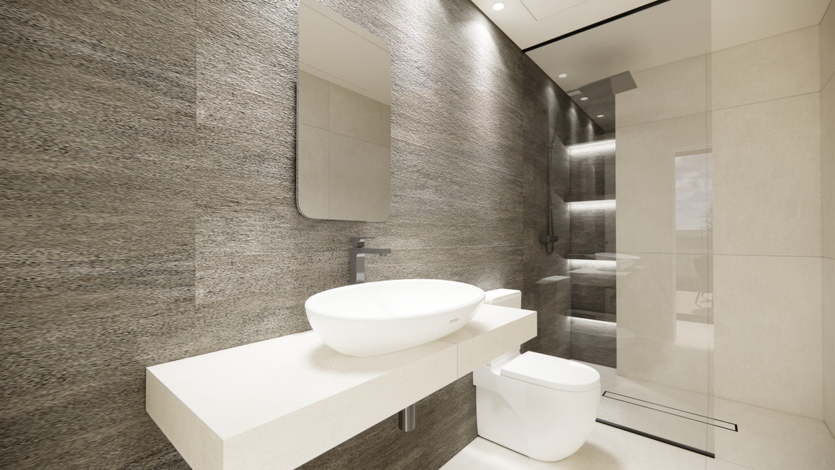 The bathrooms feature top-quality sanitary appliances, including suspended sinks, countertop sinks, shower trays, and glass screens.