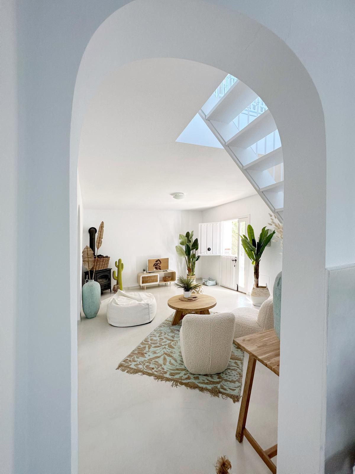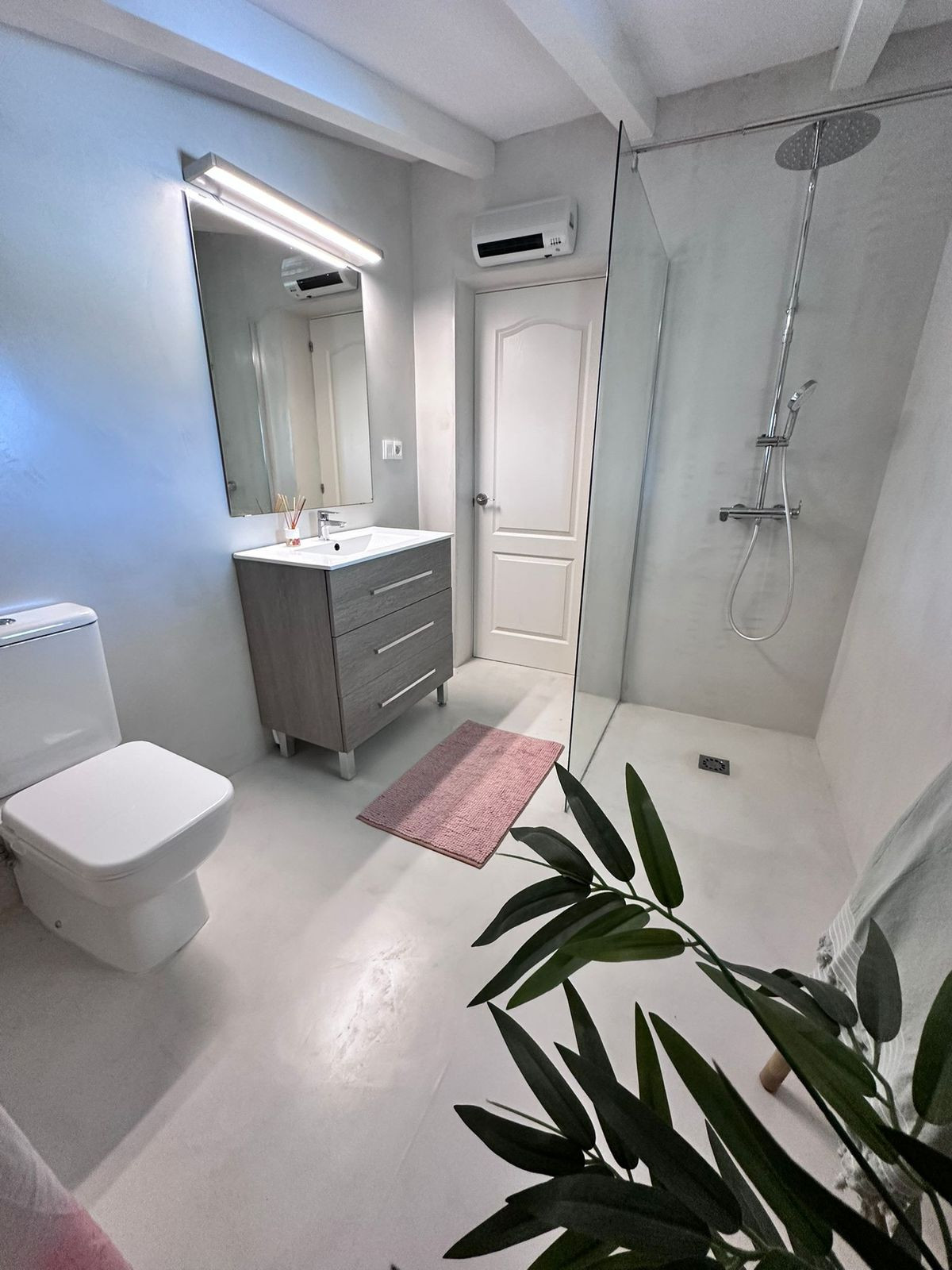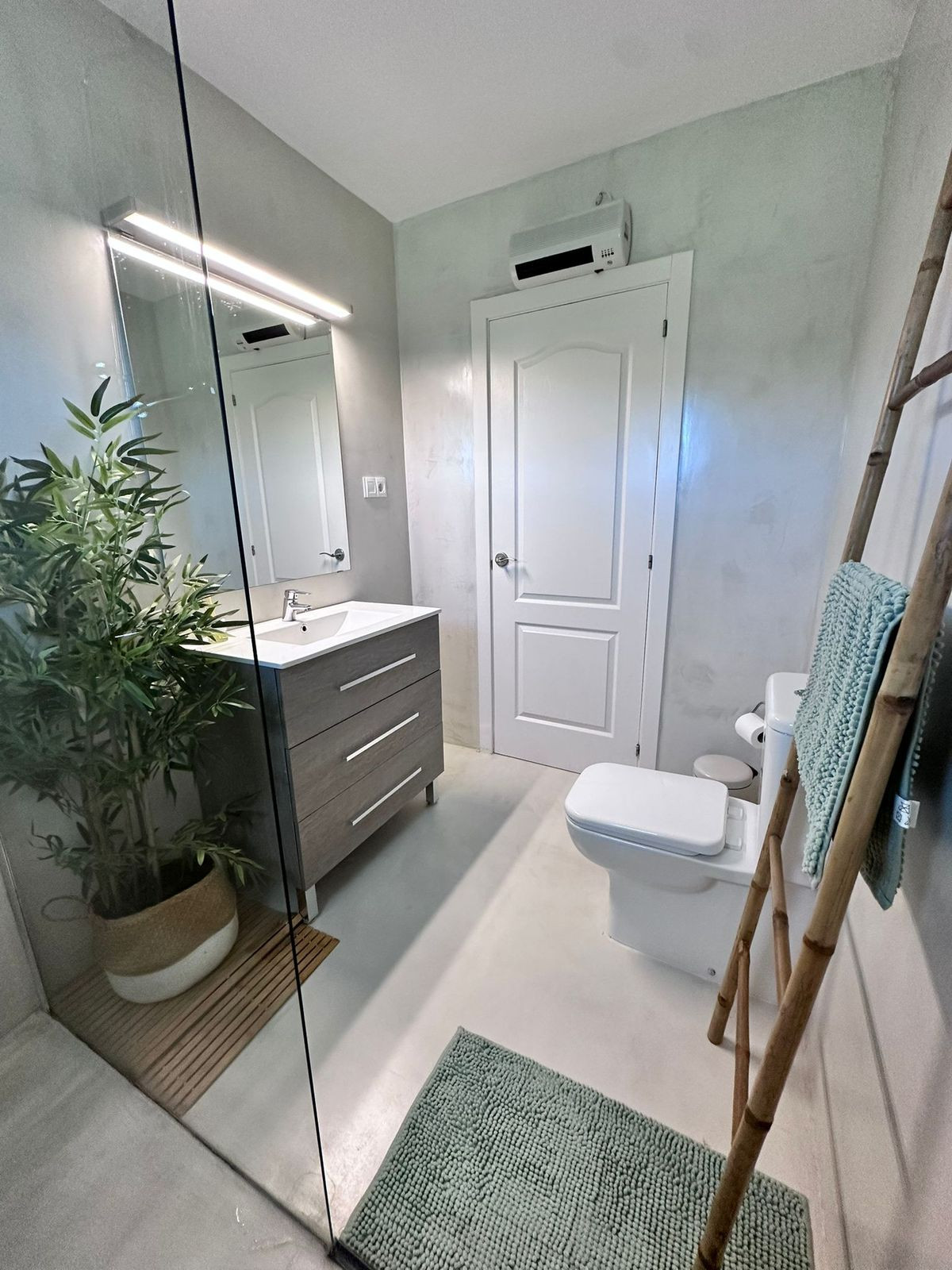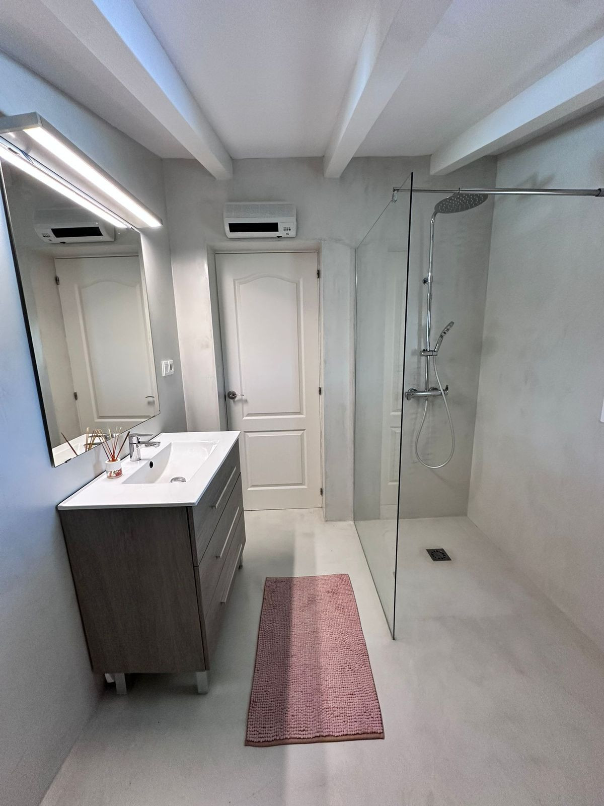 Micro cement floors true the house and bathrooms.