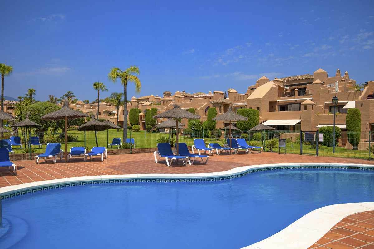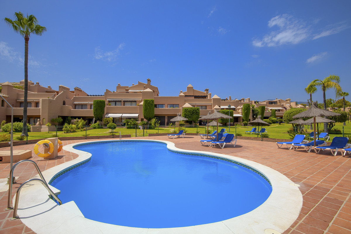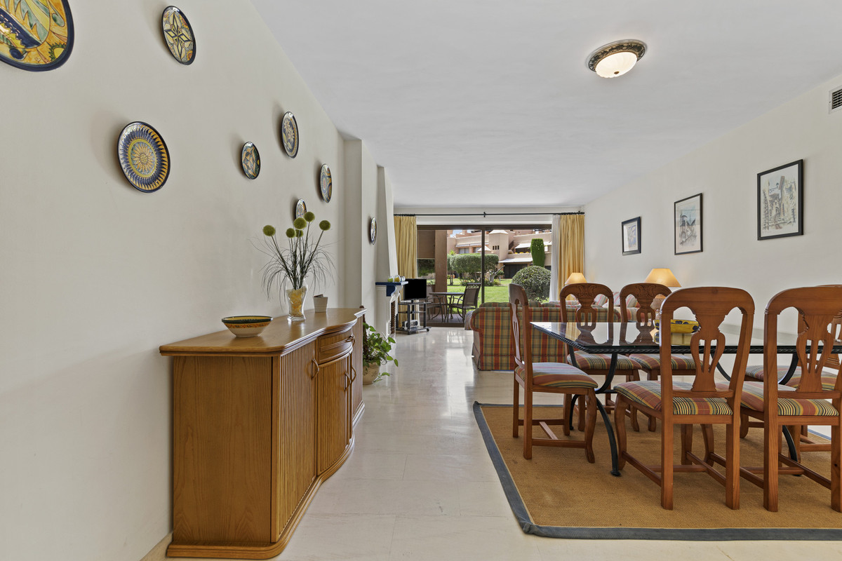 Inside, the apartment is bright and inviting, with air conditioning throughout for year-round comfort. The spacious living area provides direct access to the terrace, garden, and pool area, enhancing the sense of indoor-outdoor living. An exterior awning offers shade on sunnier days, extending the use of the terrace.