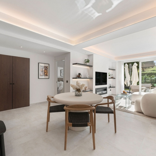 The living room opens onto a large private terrace with outdoor seating and dining areas, perfect for savoring the Mediterranean lifestyle while taking in breathtaking views of the golf course and mountains.