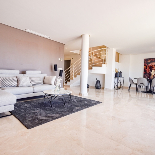 Experience luxury coastal living in this stunning 8th-floor apartment located in the prestigious Los Flamencos residential complex in Playa Paraíso, Cartagena. Situated on the first line to the beach, this modern, fully furnished home offers breathtaking panoramic views of both the Mar Menor and the Mediterranean Sea from its spacious balcony.