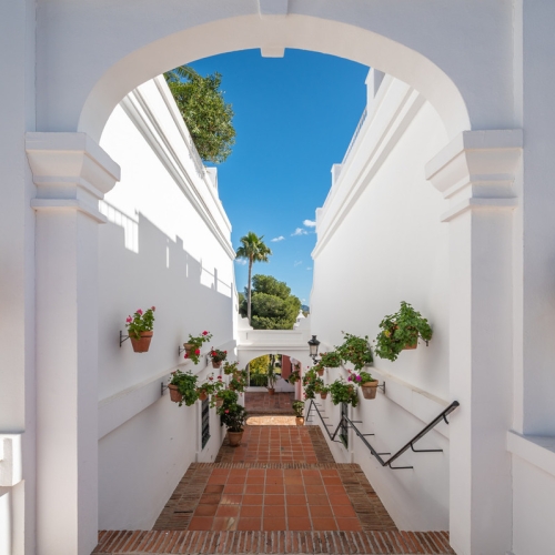 Aloha Pueblo is a unique development inspired by the charm of a classic Andalusian village. Built in the late 1980s, the community features cobbled streets, whitewashed facades, flower-filled walkways, and tranquil squares. It combines timeless aesthetics with modern comforts, including a communal swimming pool, landscaped gardens, and 24-hour security with surveillance and on-site guards.