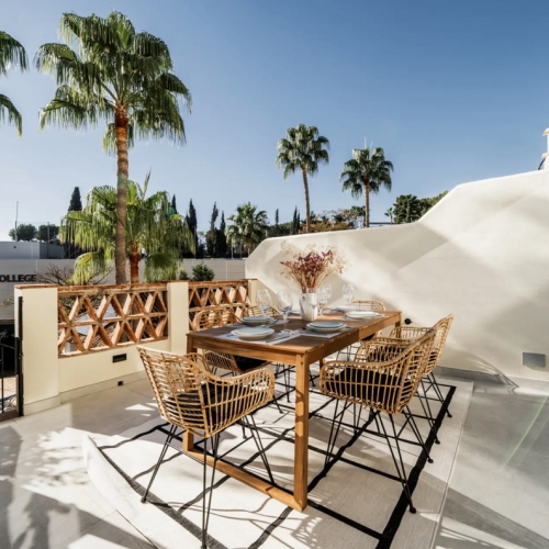 Nestled in the heart of the prestigious Aloha Pueblo community in Nueva Andalucía, this thoughtfully refurbished townhouse (refurbished in 2024) offers a blend of traditional Andalusian architecture and contemporary living.