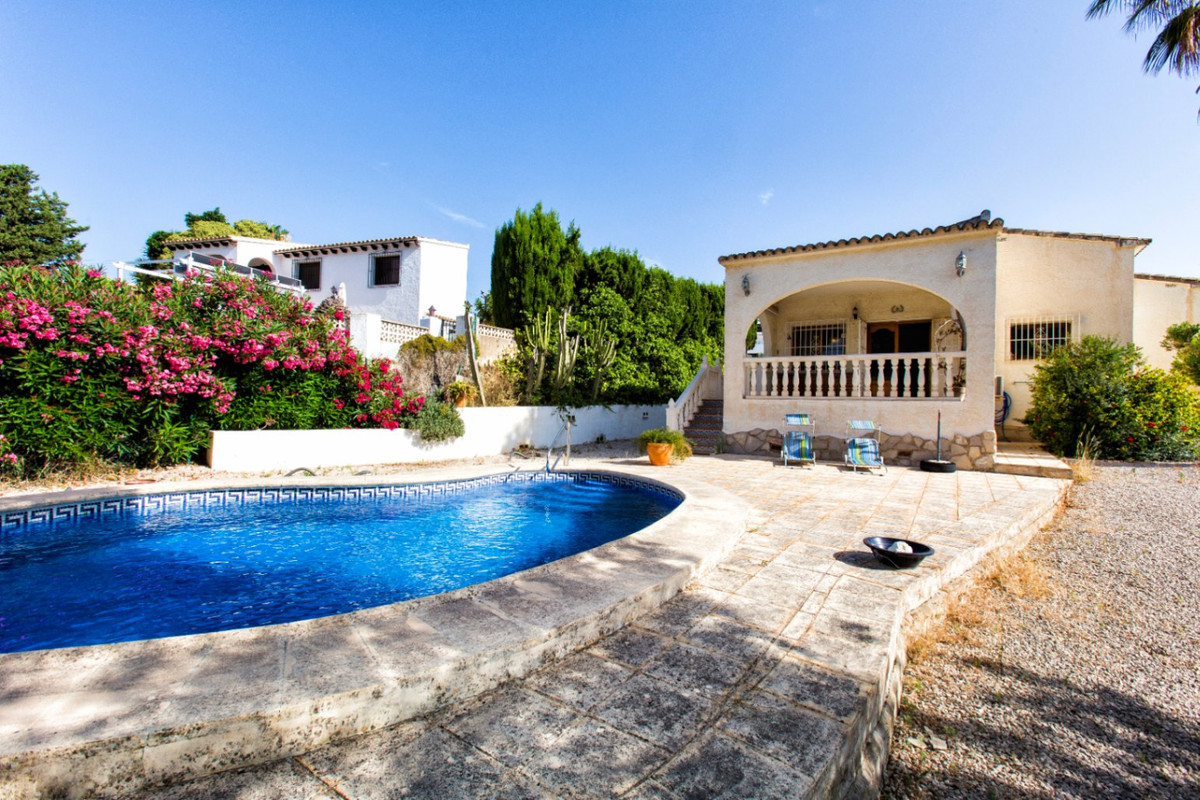 Mediterranean villa for sale; quietly located on a cul-de-sac in Empedrola in Calpe. Plenty of sun due to its south-facing position with a little sea view (this view can be improved by pruning the pine trees on the property).