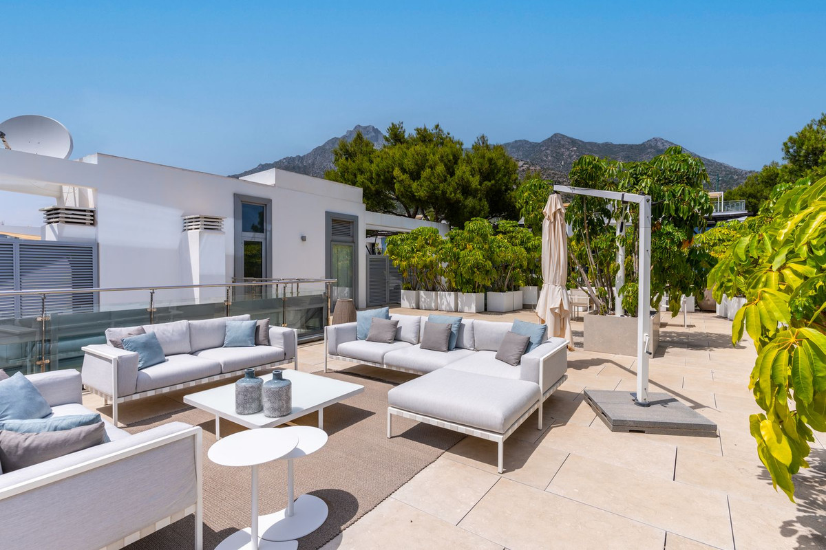 Above is a 150 m² solarium. Spectacular 180º panoramic views of the sea, the African coast, the famous Puerto Banús harbour and La Concha mountain. The sunsets from this place are magical.