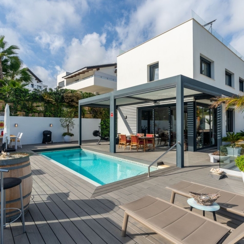 • Upper Floor: Two double bedrooms, both with en-suite bathrooms. The master suite offers a dressing area and access to a private terrace with breathtaking views of the mountains and the sea.