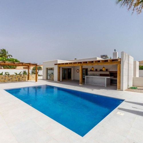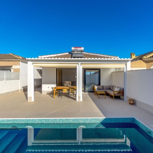 This elegant detached villa of 290 m², located in the prestigious Residencial El Faro in Torrevieja, has been recently renovated and combines modern design, functionality, and a privileged location with open sea views.