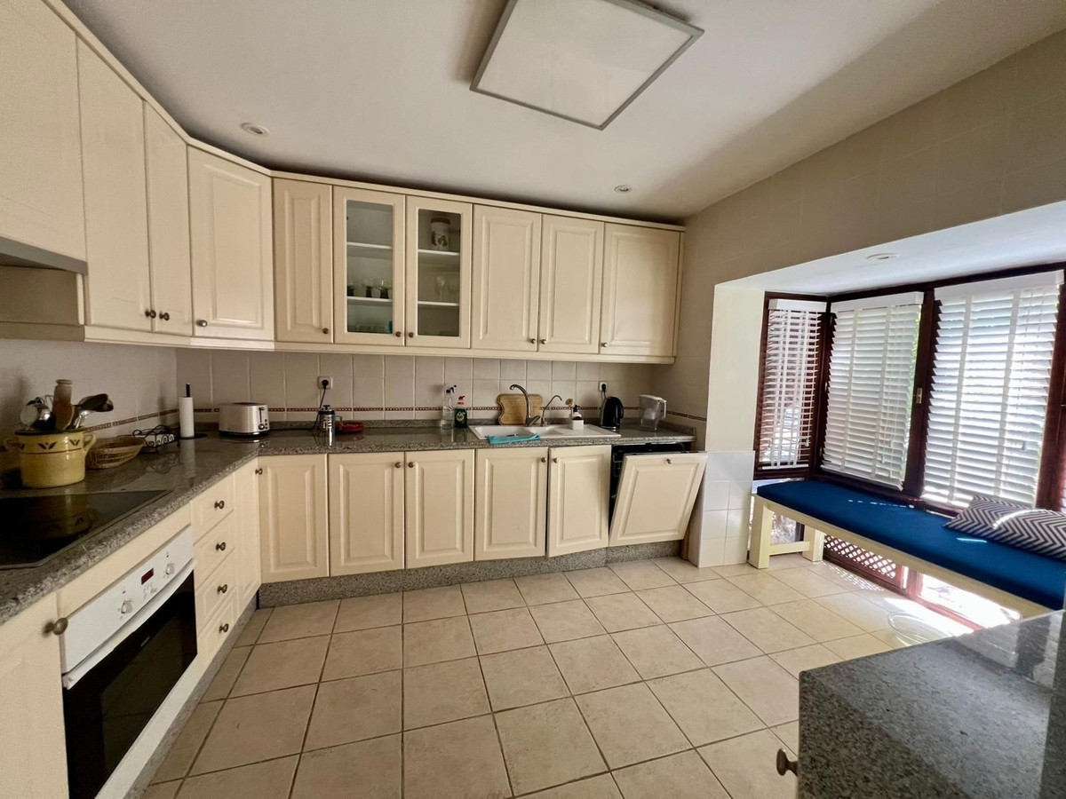 On the ground floor, a spacious entrance hall opens to a grand living and dining area with direct access to the main terrace — the perfect setting for al fresco dining beside the garden and pool. The kitchen, featuring a charming bay window and cosy seating nook, is designed for relaxed mornings and long Mediterranean lunches. This level also hosts two generous en-suite bedrooms, ideal for family or guests.
