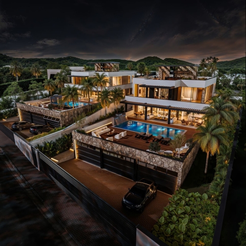 This modern-style villa stands out for its seamless connection between indoor and outdoor spaces, large windows that flood the interior with natural light, and views of the Mediterranean landscape. Its atmosphere is balanced, bright, and sophisticated.