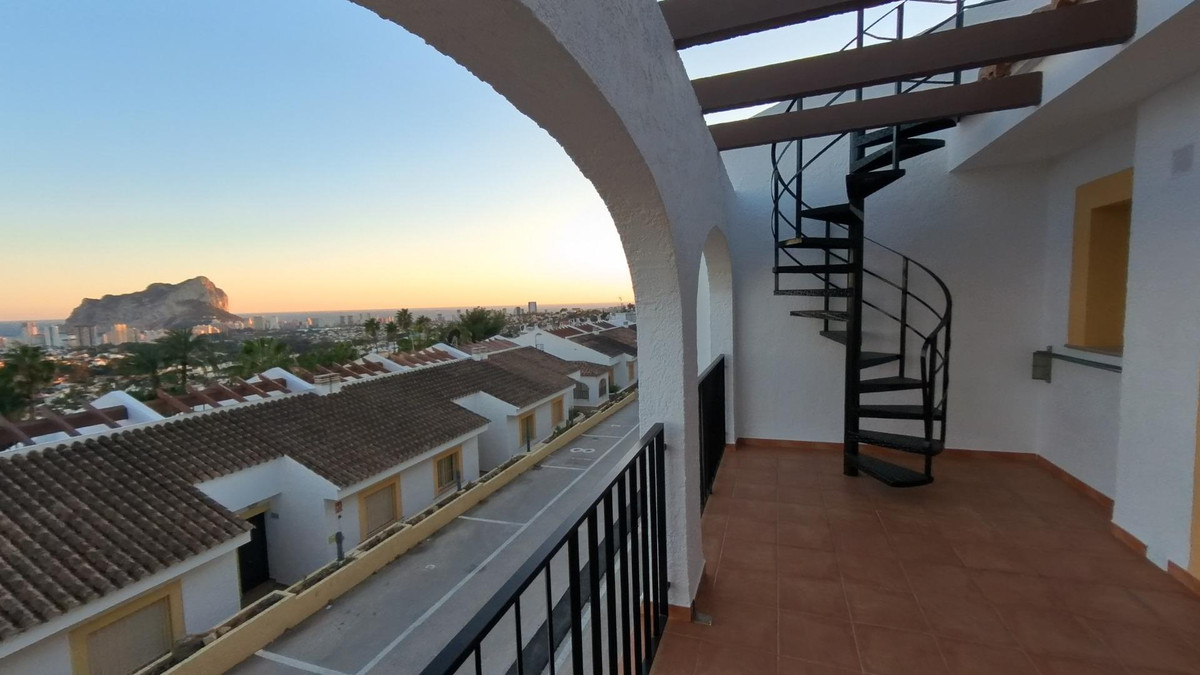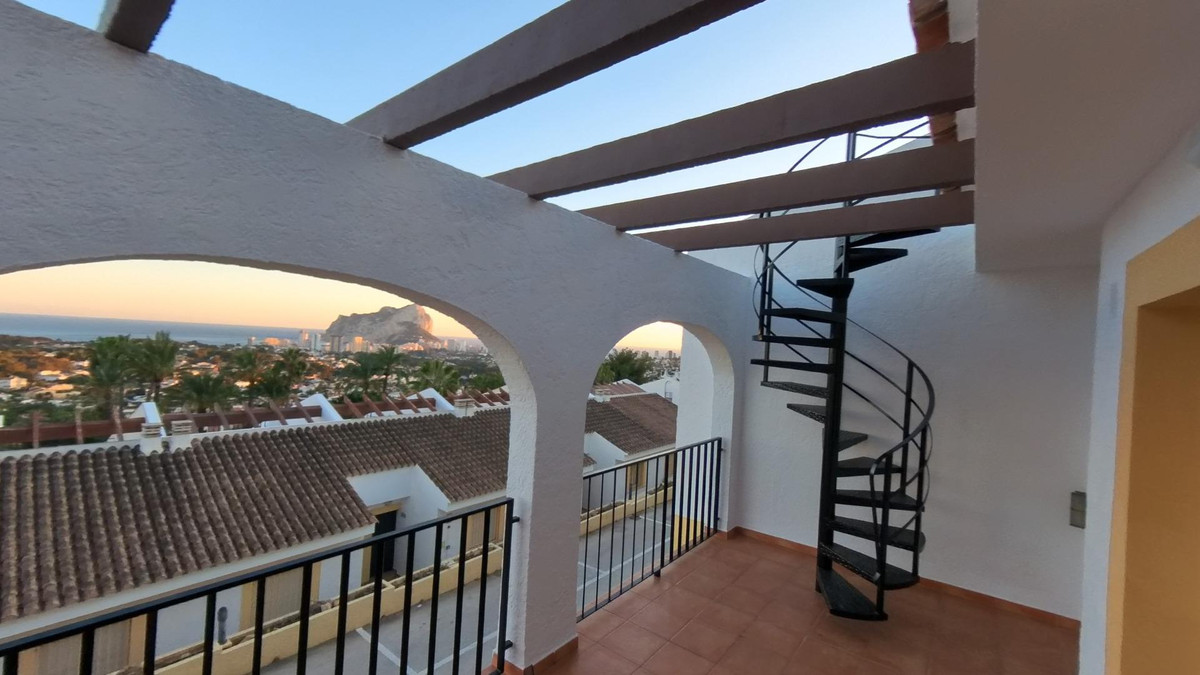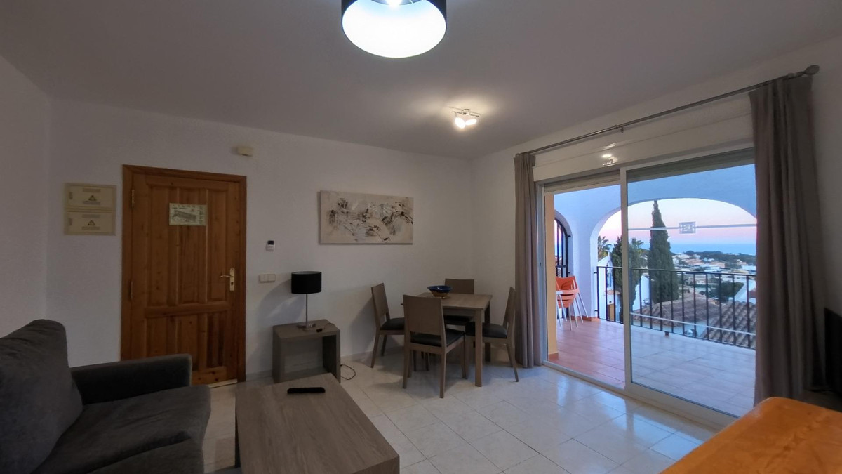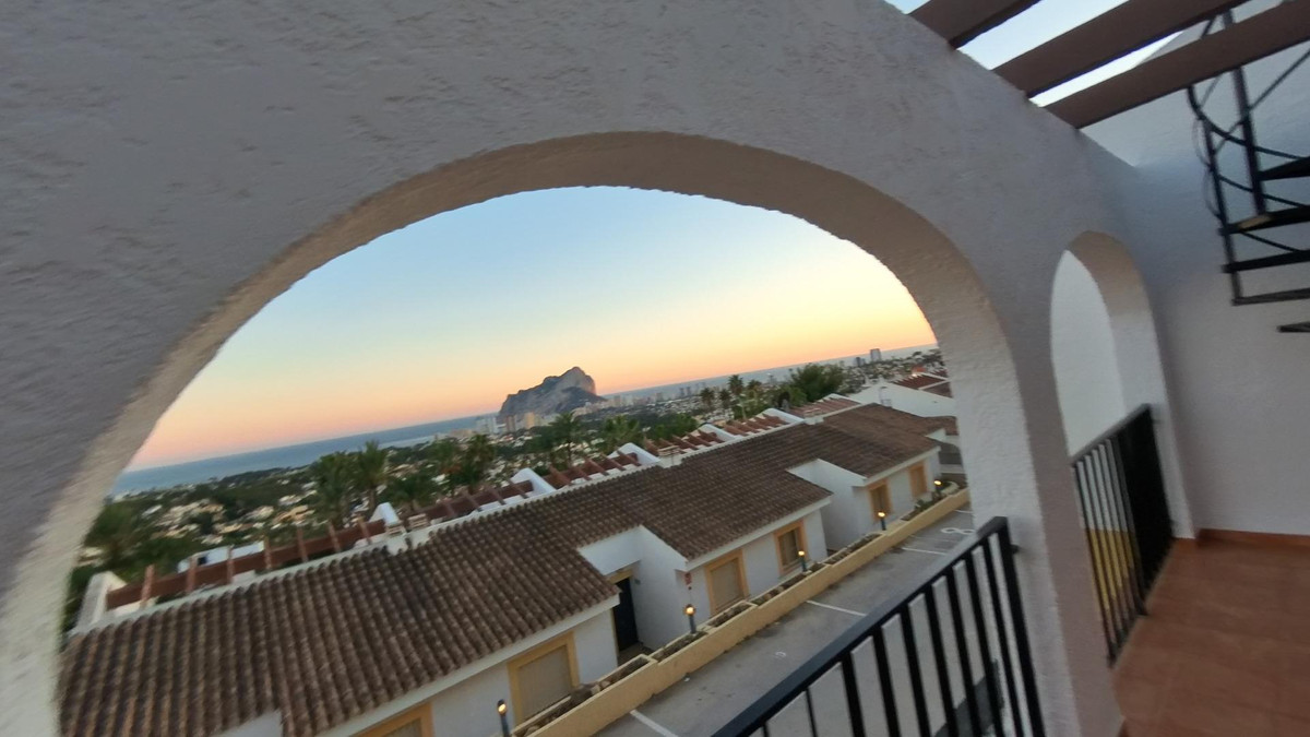 This apartment is part of a residential complex with 200 homes, located approximately 10 minutes from the center of Calpe and the sea. The apartment features a spacious bedroom, a full bathroom, a semi-open kitchen, and a living/dining room. From the living room, you can access a large terrace with stunning views of the sea and the Peñón (rock), and from this terrace, you can go up to a 23 m² solarium.