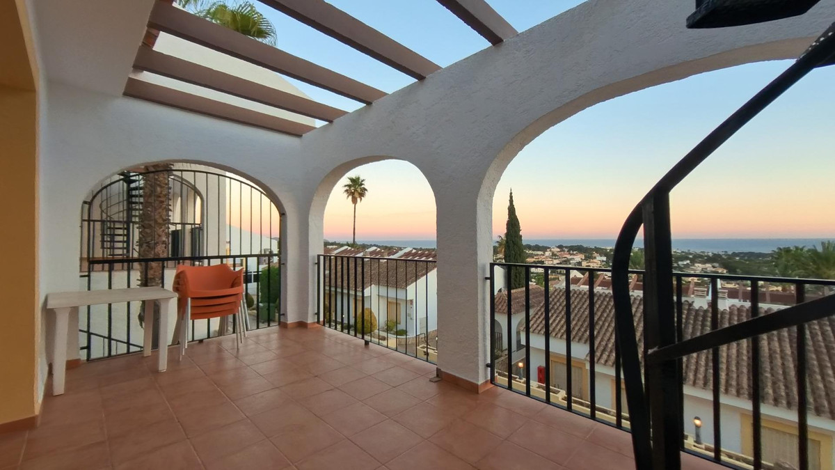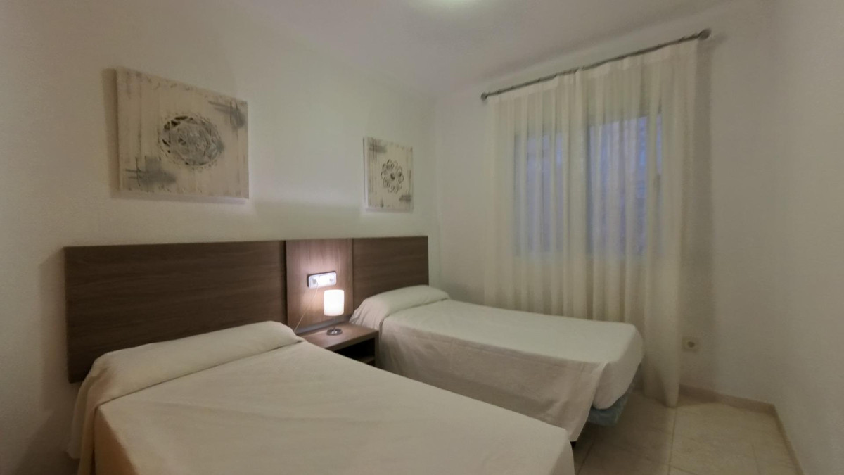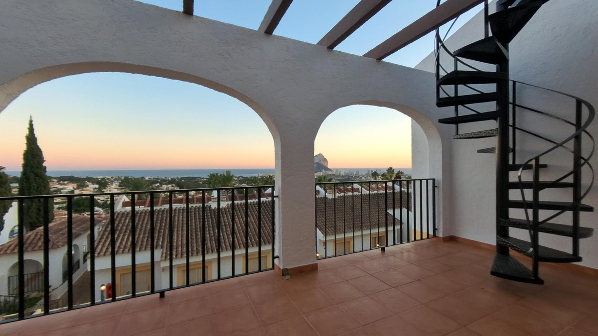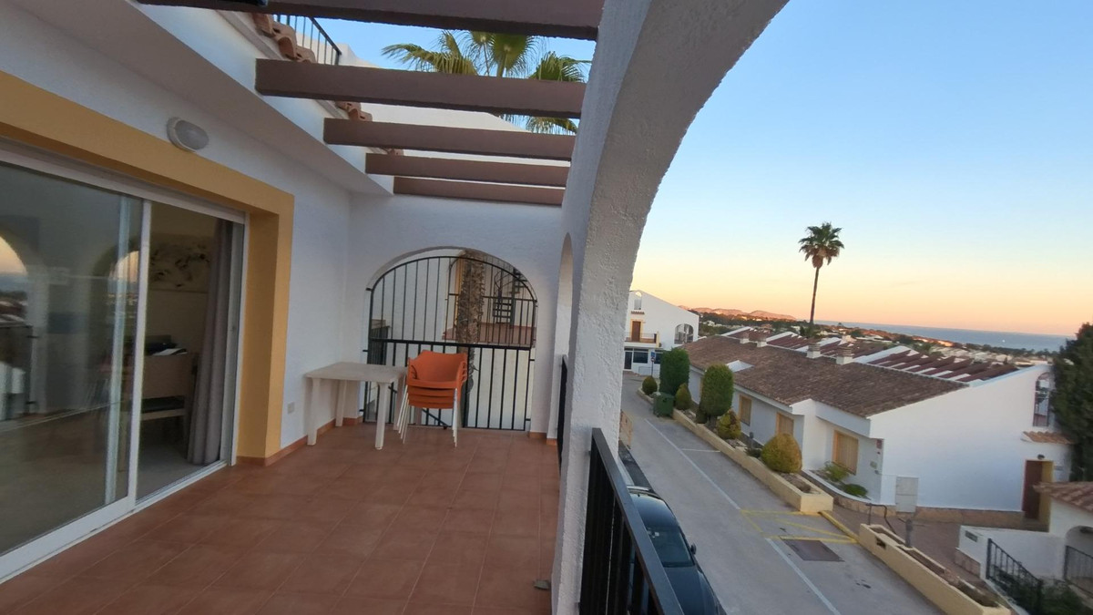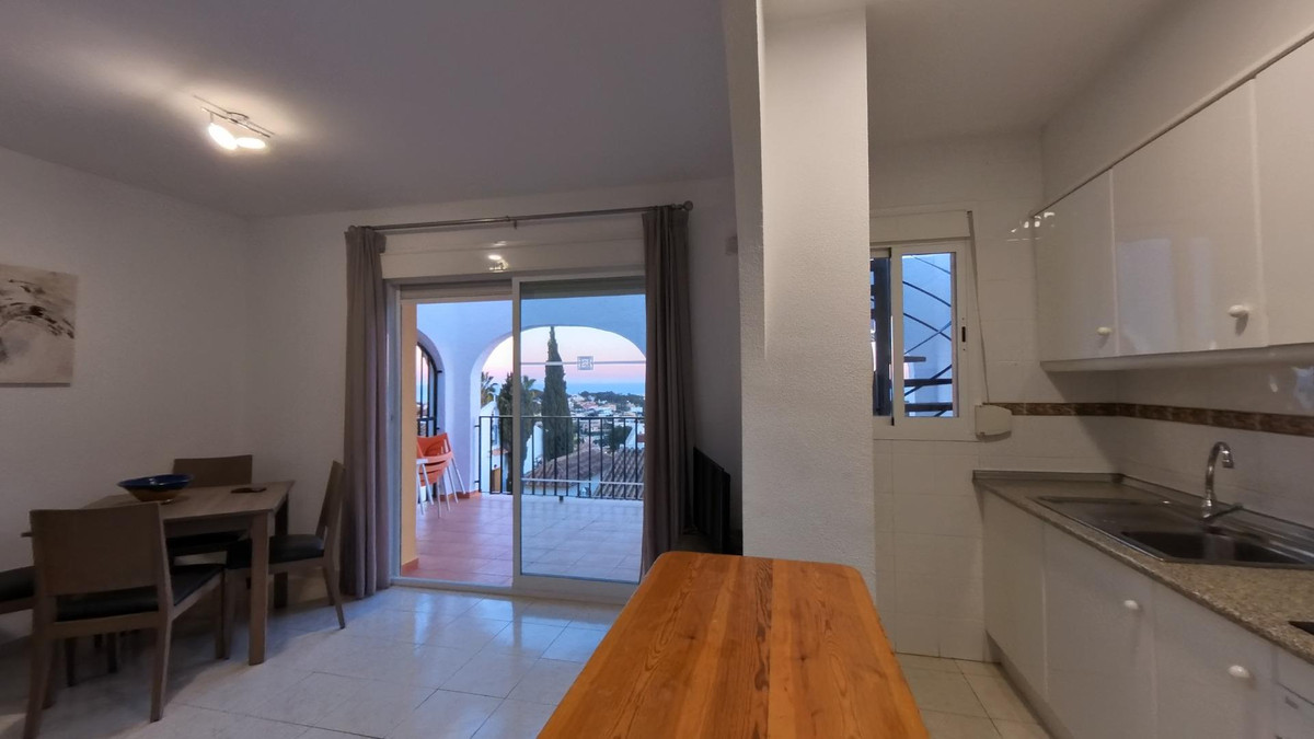 This apartment is part of a residential complex with 200 homes, located approximately 10 minutes from the center of Calpe and the sea. The apartment features a spacious bedroom, a full bathroom, a semi-open kitchen, and a living/dining room. From the living room, you can access a large terrace with stunning views of the sea and the Peñón (rock), and from this terrace, you can go up to a 23 m² solarium.