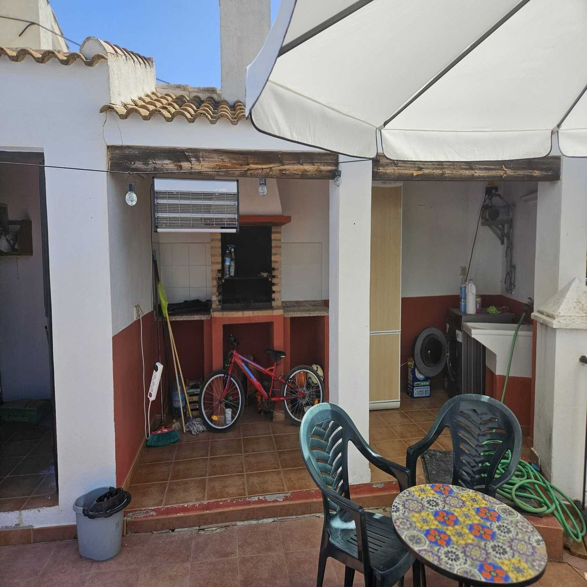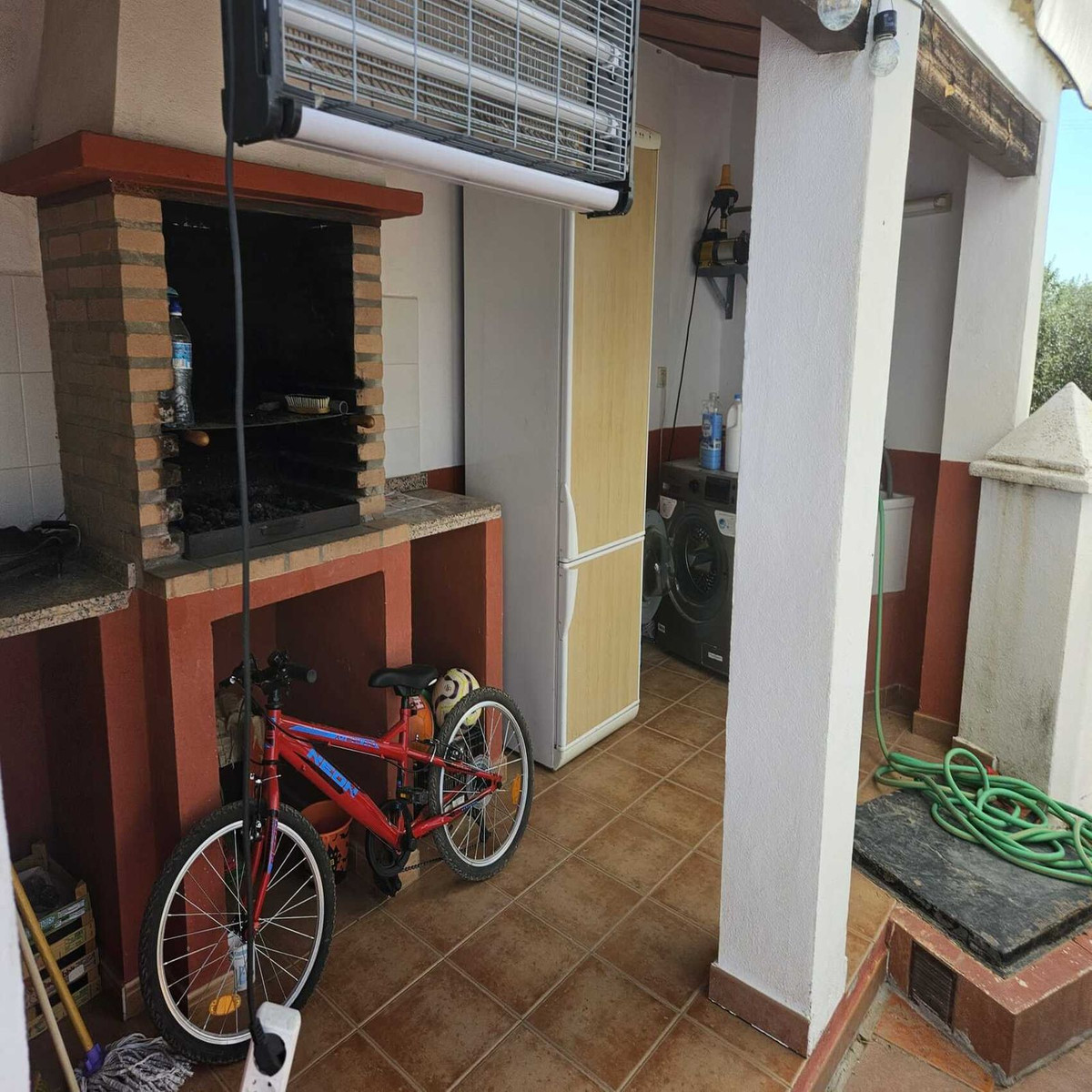 One bathroom, kitchen, and living room with fireplace. Outside, there is a patio with storage space, a barbecue, and a washing machine.