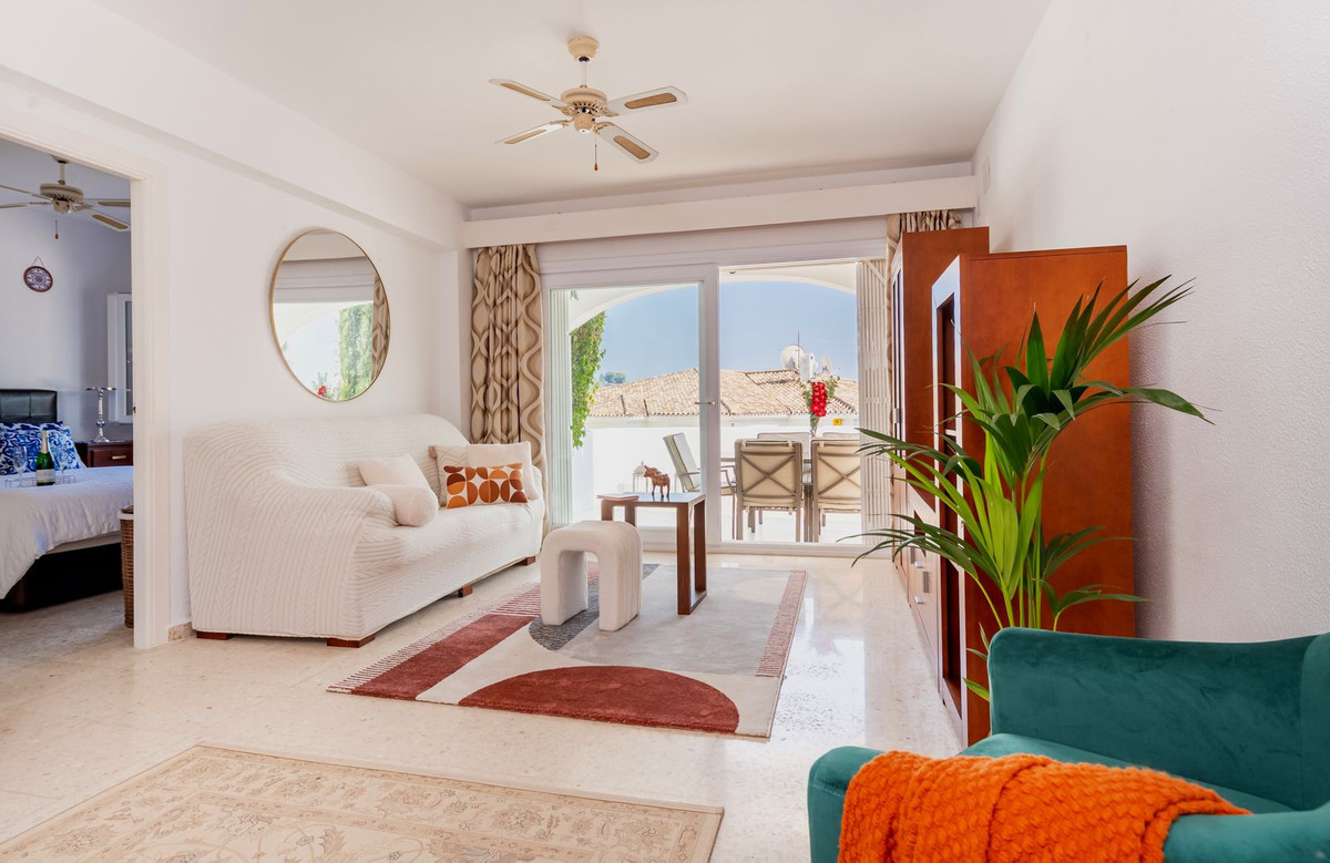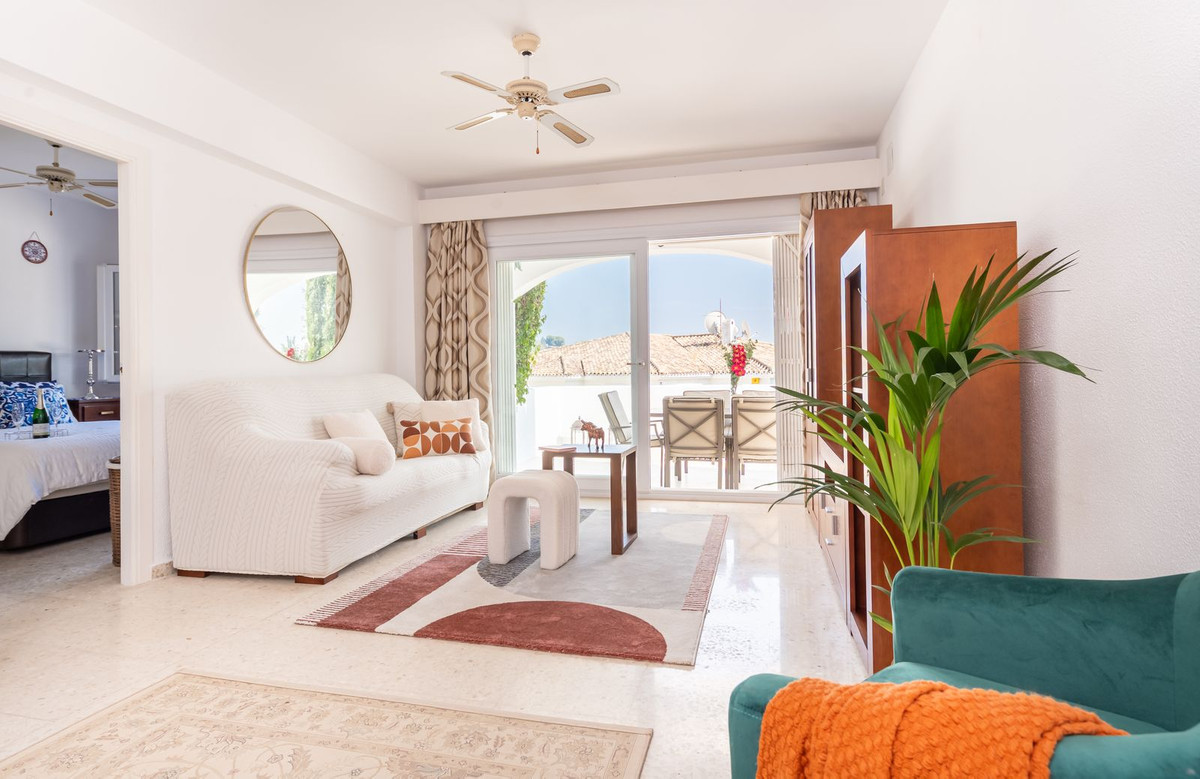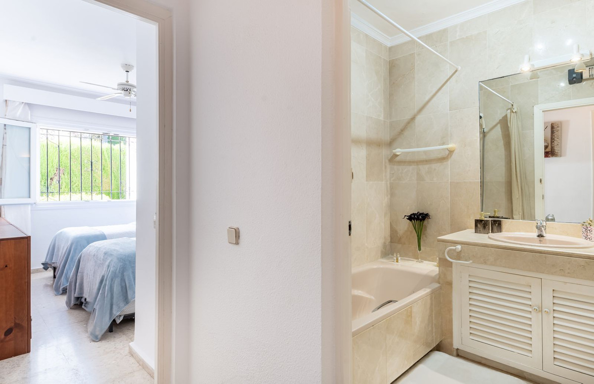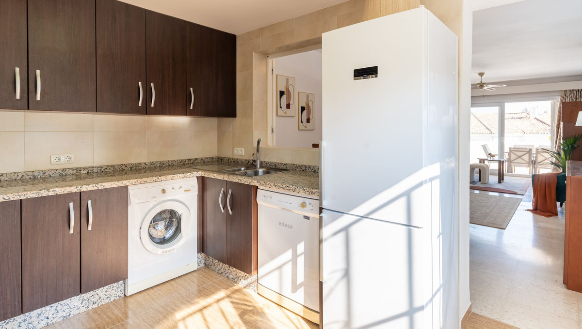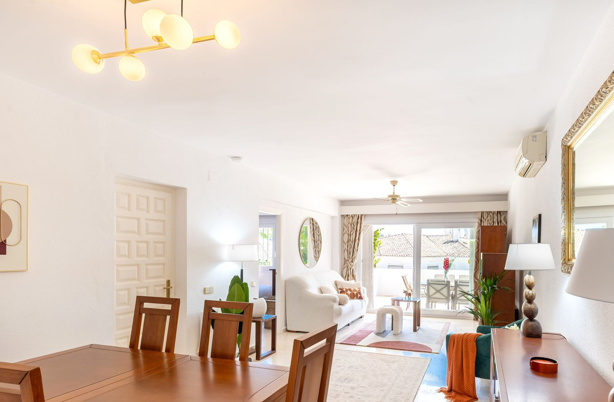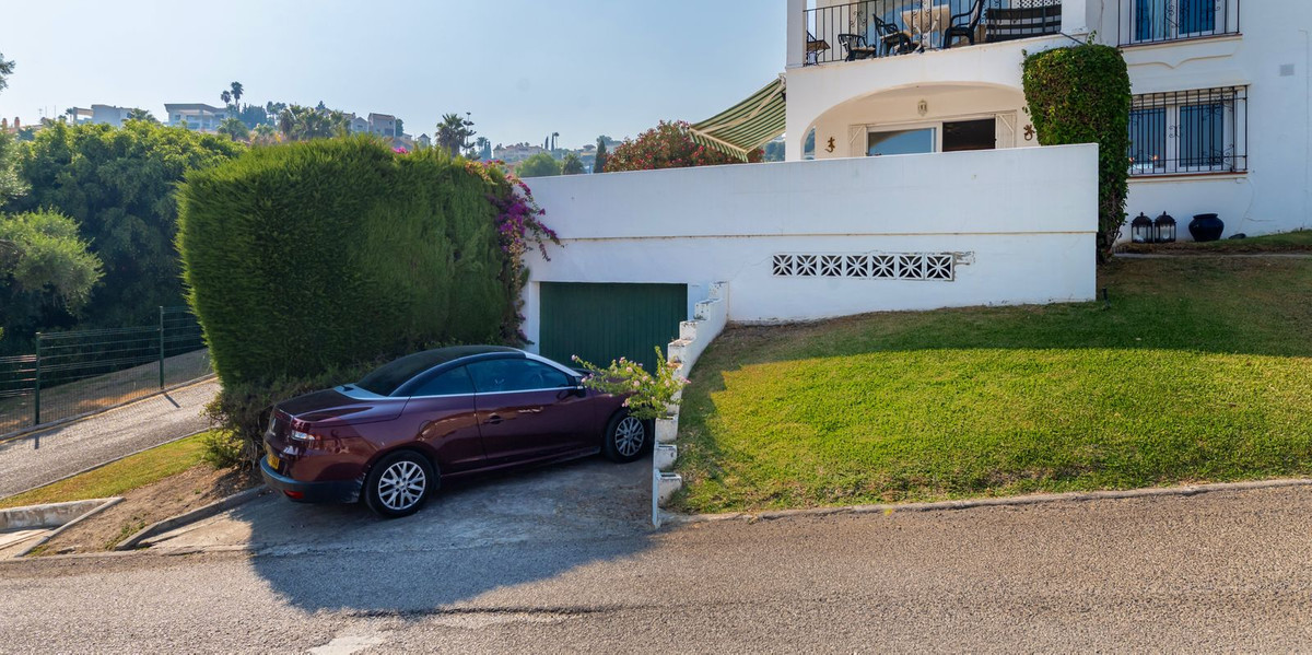 The lounge featurs wall to wall picture windows offering views to the exquisite residential Andalucian tropical green environment and access to a fully renovated enclosed and open exterior terrace with ample dining, sunbathing and relaxation room. A further garden can be accessed from the terrace with steps leading directly to the property garage for 1 car with exterior concourse for parking a further 2nd car.