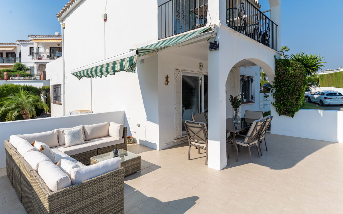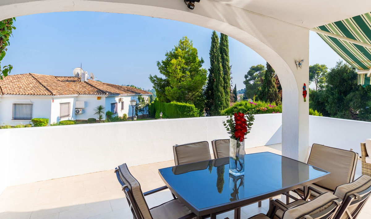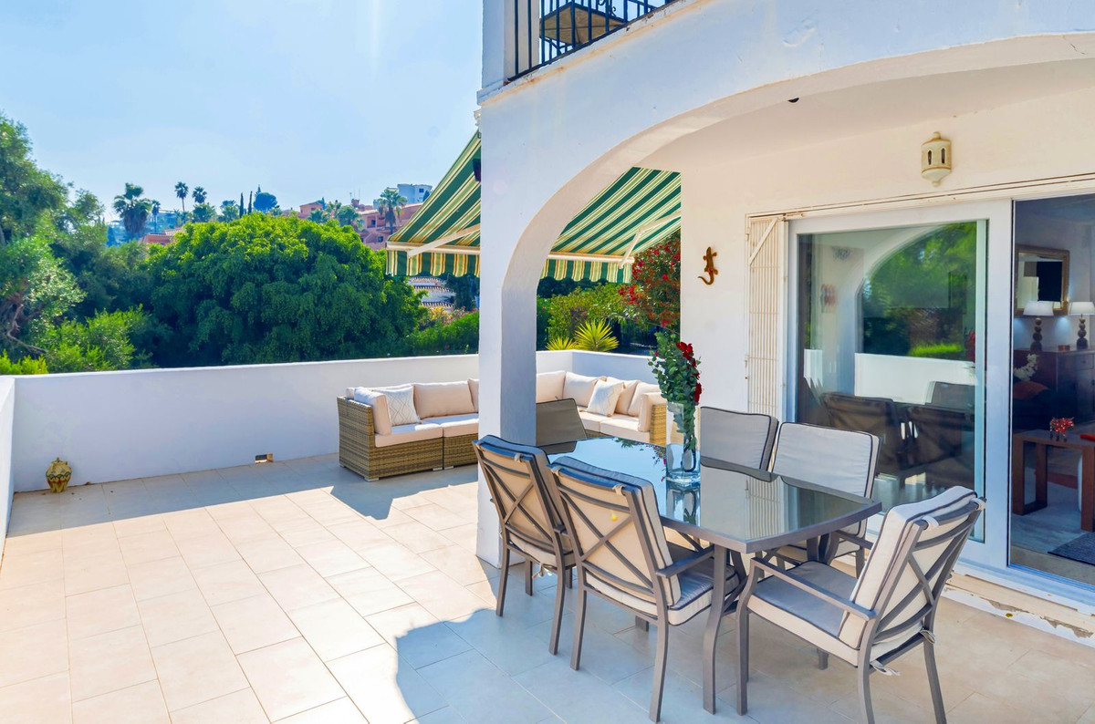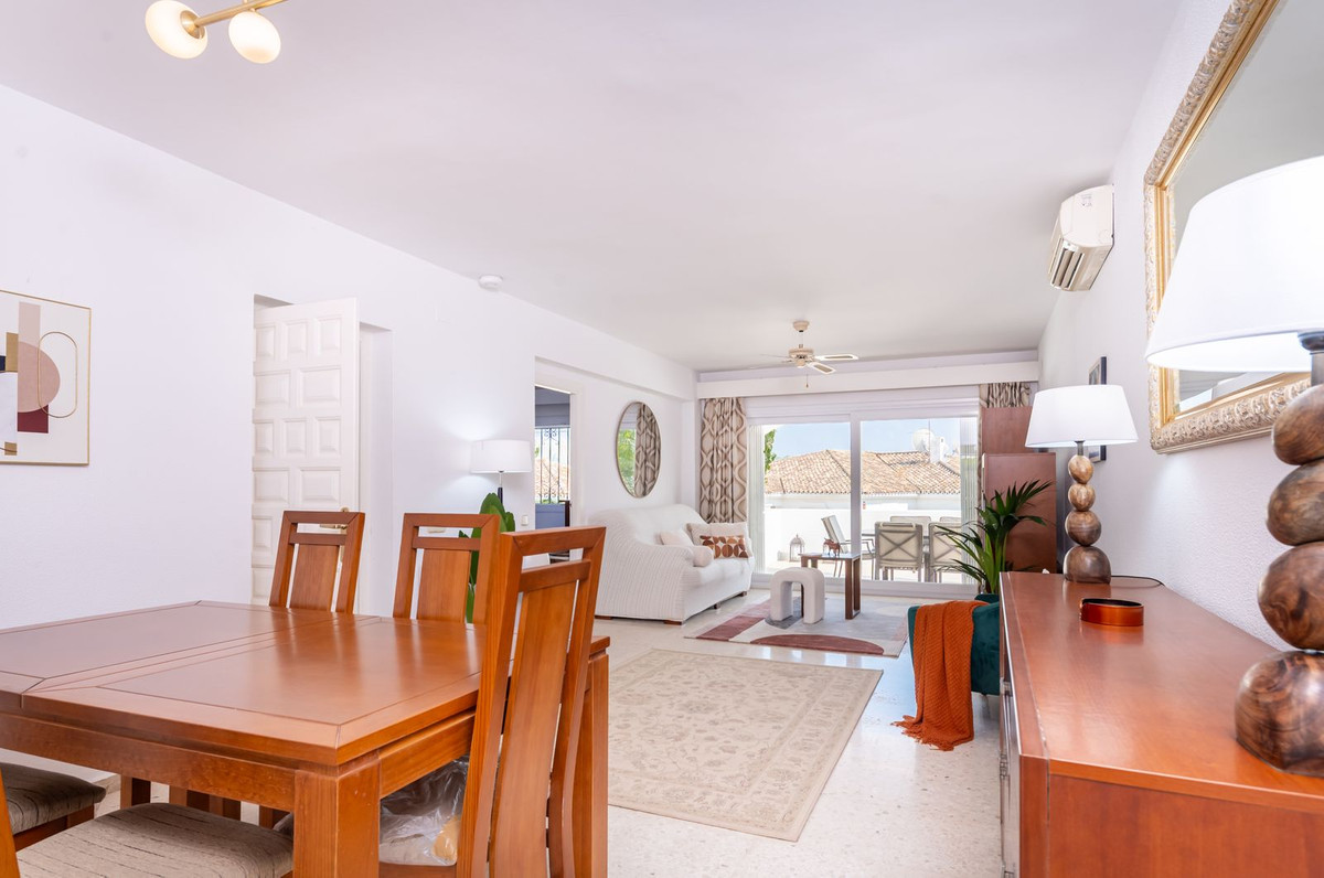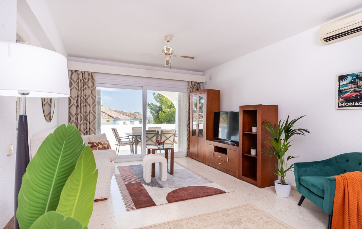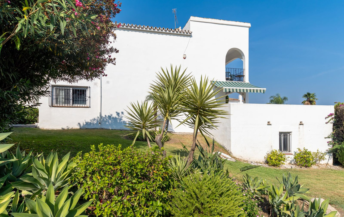 The lounge featurs wall to wall picture windows offering views to the exquisite residential Andalucian tropical green environment and access to a fully renovated enclosed and open exterior terrace with ample dining, sunbathing and relaxation room. A further garden can be accessed from the terrace with steps leading directly to the property garage for 1 car with exterior concourse for parking a further 2nd car.