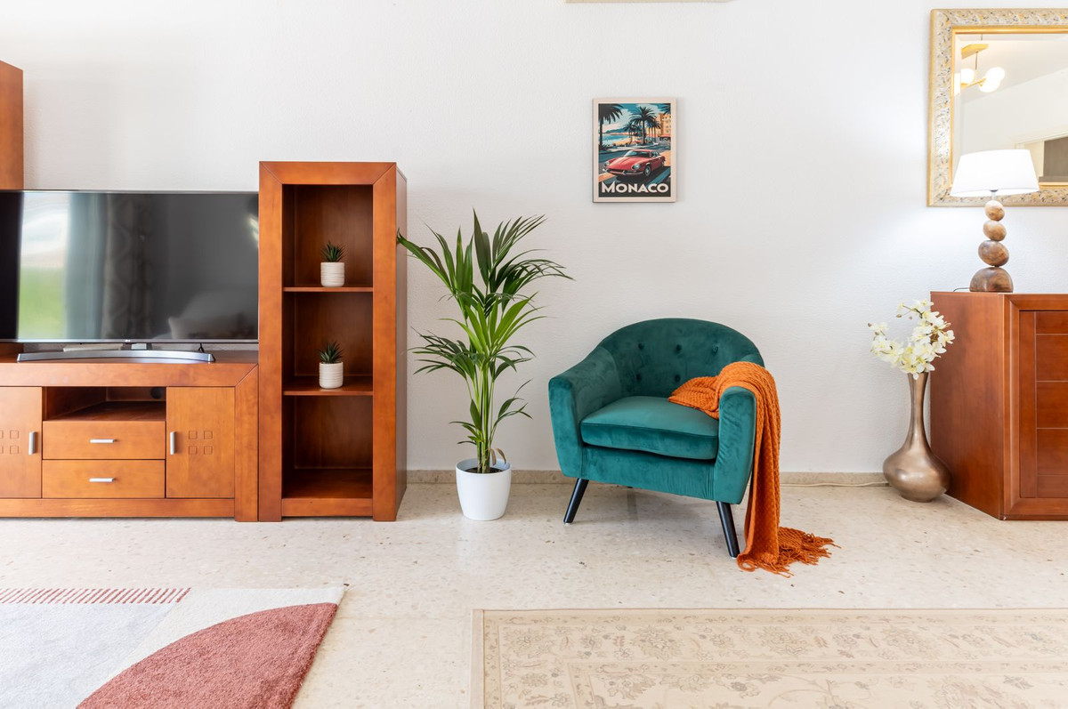 Upon entry, a fully renovated semi open plan dark oak kitchen with high standard appliances is situated on front of a remarkably spacious lounge / dining room complimented with contemporary acacia wood furniture and high standard modern decoration. State of the art treble thickness climatic windows are installed throughout the apartment with Daikin air-conditioning and electric ceiling fans, flat wall mounted storage heaters, high standard light fittings, made to measure curtains, Andalucian sliding railings and original white cream mother of pearl effect polished flooring.
