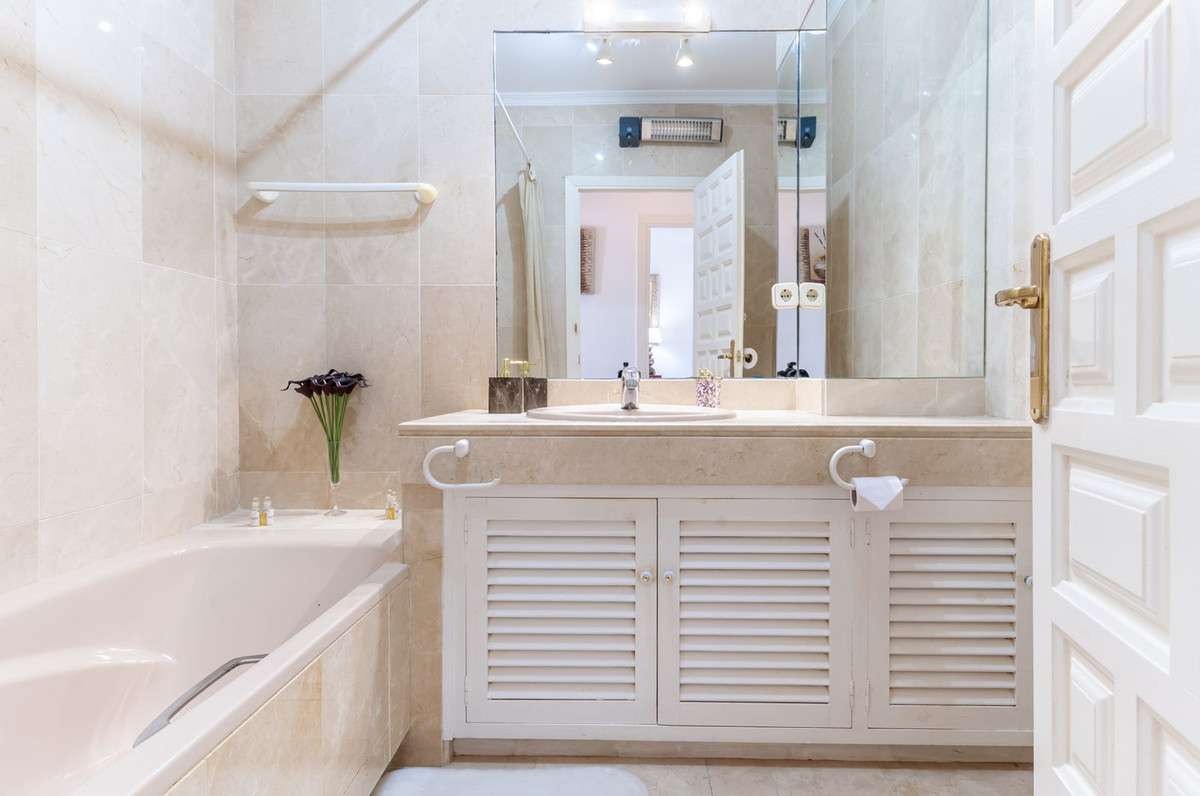 A long private corridor accessed from the lounge leads to an immaculate renovated luxurious light cream marble bathroom with a bathtub and marbletop vanity unit.