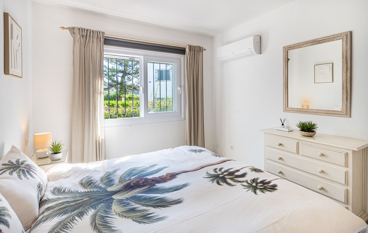 The Master bedroom with a super king bed equipped with double panelled wardrobes and offers views to the tropical gardens - Adjacent luxurious Andalucian master bathroom designed with an immaculate white marble integrated vanity unit with purpose built white carpentry, a porcelain bathtub with shower, double windows and integrated spots to the ceiling. A further guest bedroom with ensuite bathroom offers 2 beds with beautiful garden views.