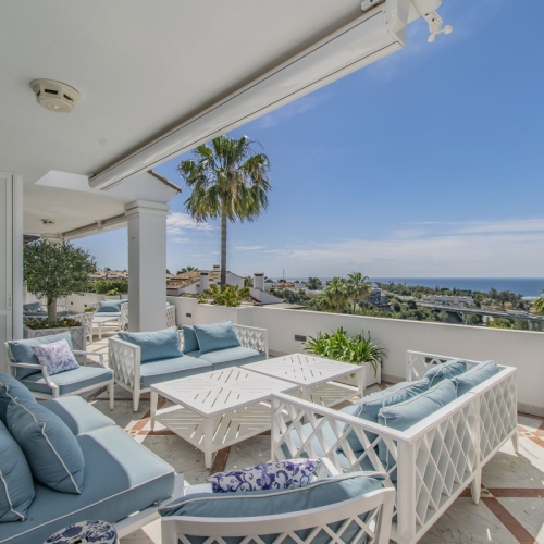 Discover this spacious and bright flat in an iconic building with an exceptional location just 30 metres from the seafront promenade and surrounded by all kinds of shops, cafés, restaurants and services such as private clinics, health centres, public transport, etc. The apartment is part of a fully enclosed community and, in addition to a concierge service, has well-maintained communal areas and a swimming pool surrounded by beautiful communal gardens with a solarium. A property that undoubtedly offers everything you need to enjoy life in Marbella by the sea. It has a total built area of 113 m2 plus communal areas and a garage space not included in the price (45.000€). It is distributed in an entrance hall, a fully furnished kitchen equipped with Siemens appliances with access to a terrace, a spacious living-dining room with 2 exits to terraces, one of which is enclosed and glazed with Lumon and fitted out as a summer dining room, a master bedroom with fitted wardrobes and en-suite bathroom, and a second bedroom with fitted wardrobe and bathroom. There is also the possibility of easily converting a space into a third bedroom, adapting it to your needs. Good quality construction. Hot and cold air conditioning, intercom, double-glazed windows. Marble floors. Optional furniture. This property is not only ideal for living by the sea and its promenade in one of the most privileged areas of Marbella, but also an excellent investment opportunity in a property that is constantly increasing in value and offering high rental yields.