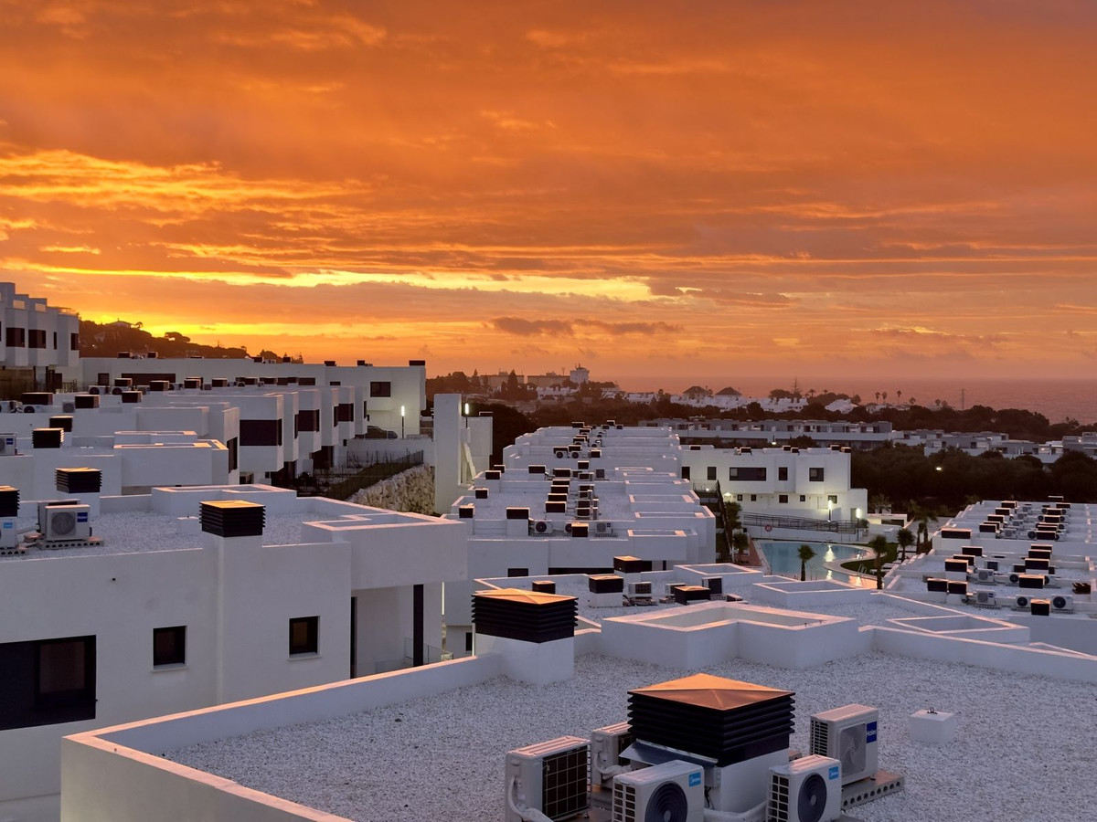 Every floor offers stunning sea views. The beach is just under a kilometer away via a nearly flat and relaxed walk. Within a few hundred meters, you will find grocery stores, a health center, charming cafés, and fine dining in La Cala de Mijas. Golf lovers will appreciate that La Noria Golf Resort is only 700 meters away, along with several other popular courses nearby.