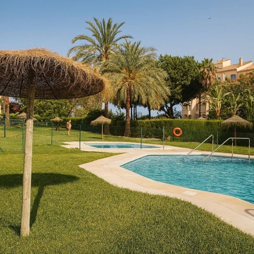Residents benefit from large communal swimming pools, paddle courts, and landscaped gardens, with a private parking space included in the price. The location offers the ideal balance of tranquility and convenience, being just a short drive from the bustling shops, world-class restaurants, and vibrant attractions of Puente Romano, Puerto Banús, and Marbella.
