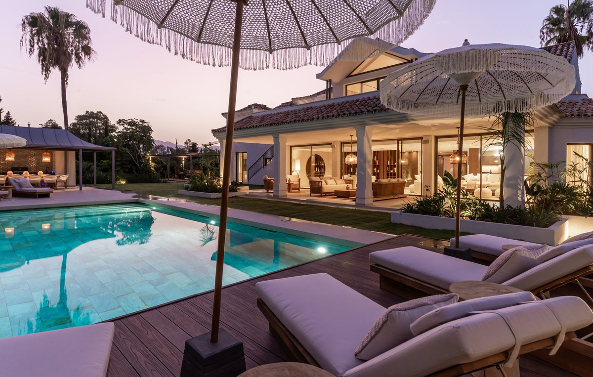 This Villa is a captivating Mediterranean residence ideally situated in the sought-after enclave of Atalaya, just 400 metres from the prestigious Atalaya Golf Club. Drawing inspiration from classic Andalusian architecture while embracing contemporary elegance, this home is a harmonious blend of style and comfort. The villa is set within beautifully landscaped grounds that envelop the property, creating a private oasis of calm. Mature trees and vibrant greenery enhance seclusion, while a sparkling private pool offers the perfect spot to relax under the Spanish sun. Generous outdoor areas make it ideal for entertaining in style.