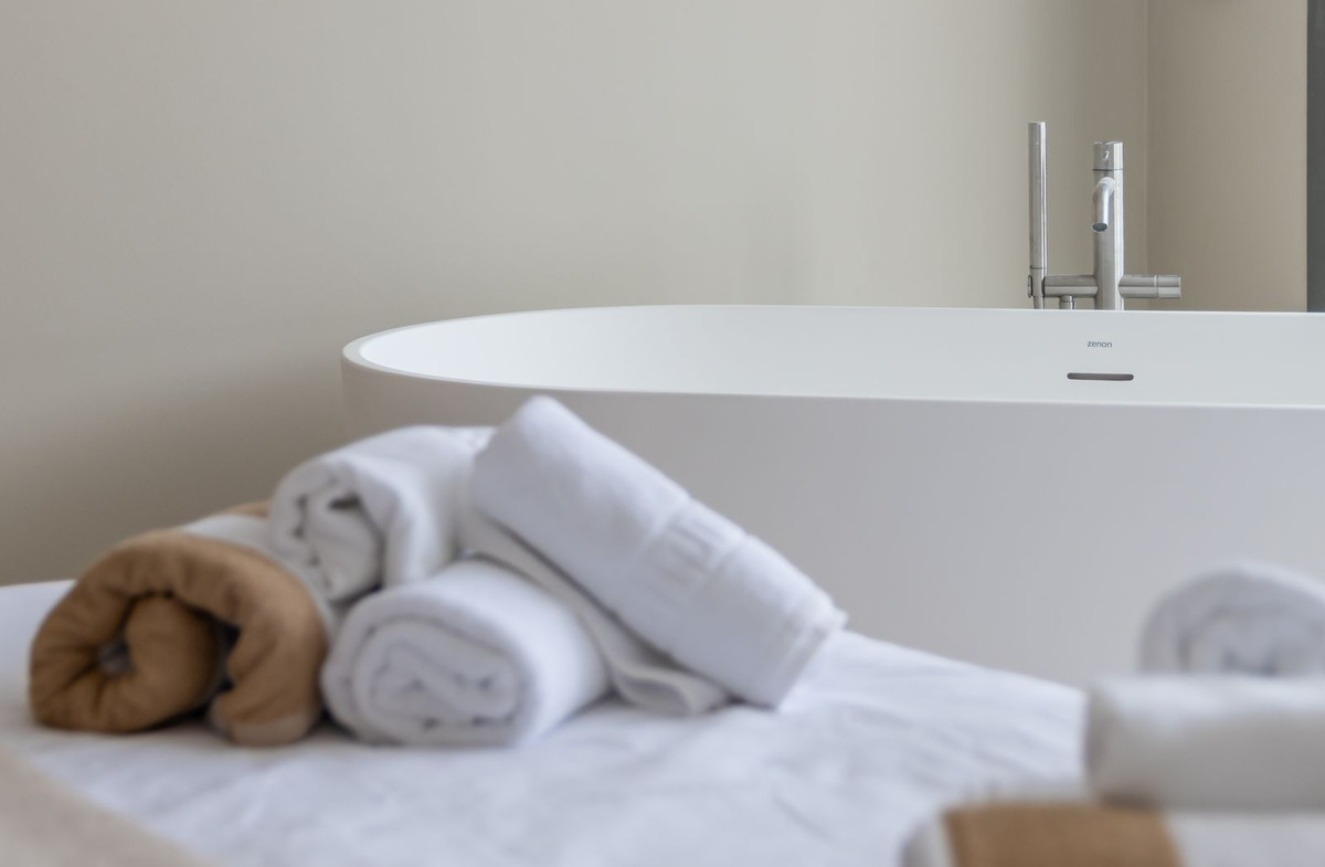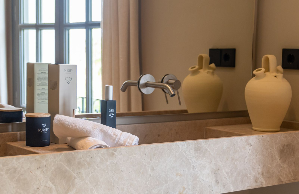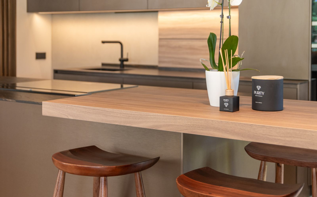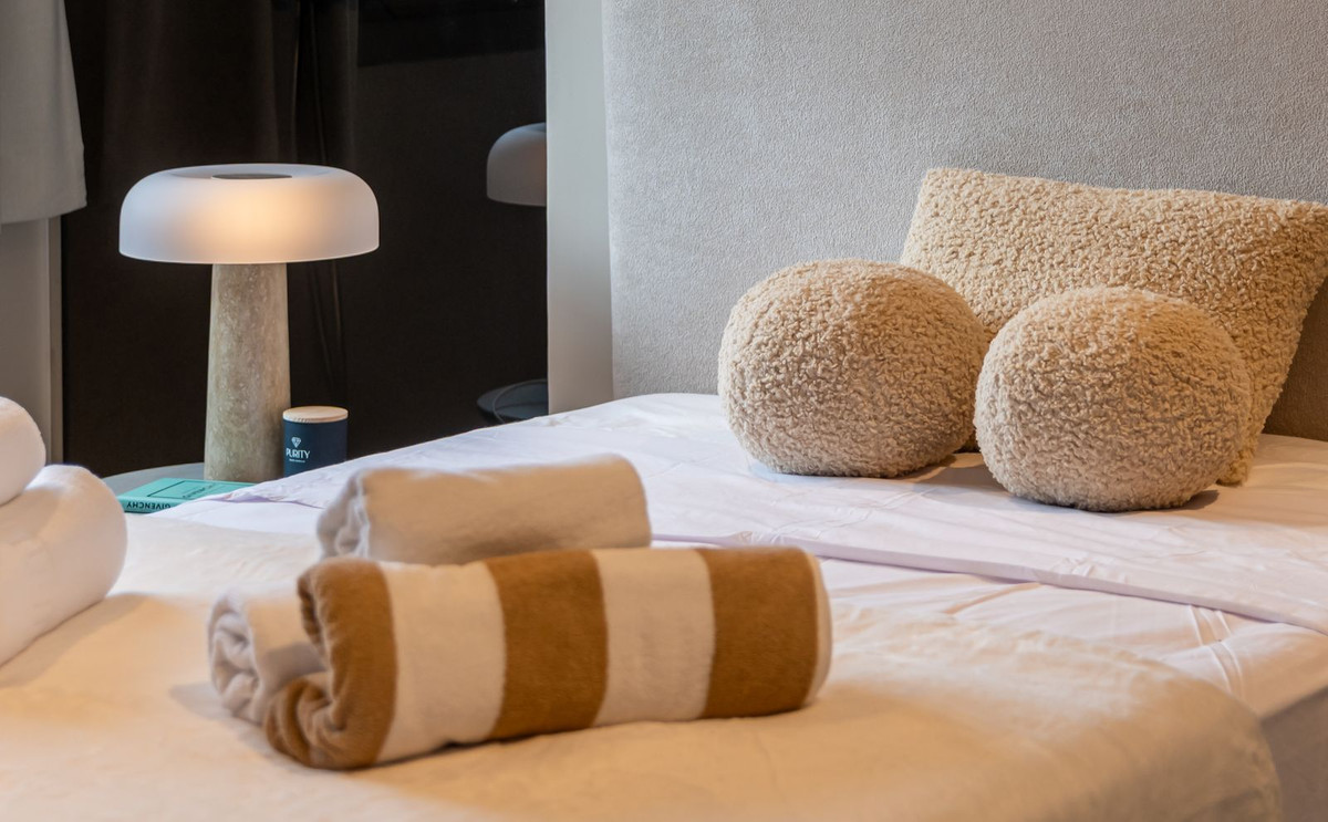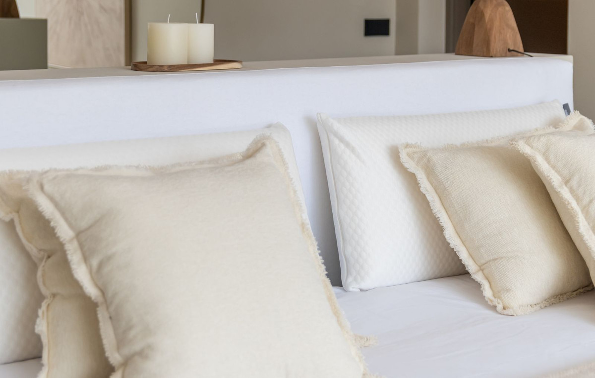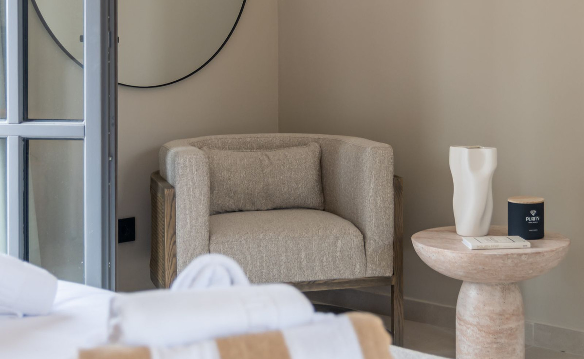 Inside, the atmosphere is warm and inviting, with modern finishes softened by natural wood accents. The open-plan kitchen and dining area flow seamlessly, with the kitchen fitted with high-quality Siemens appliances for those who love to cook. The living space opens directly onto a charming chill-out terrace, perfect for unwinding with friends or enjoying a quiet evening. Every corner of the home has been designed with comfort and hospitality in mind. Interior & exterior furniture by KOA Interior.