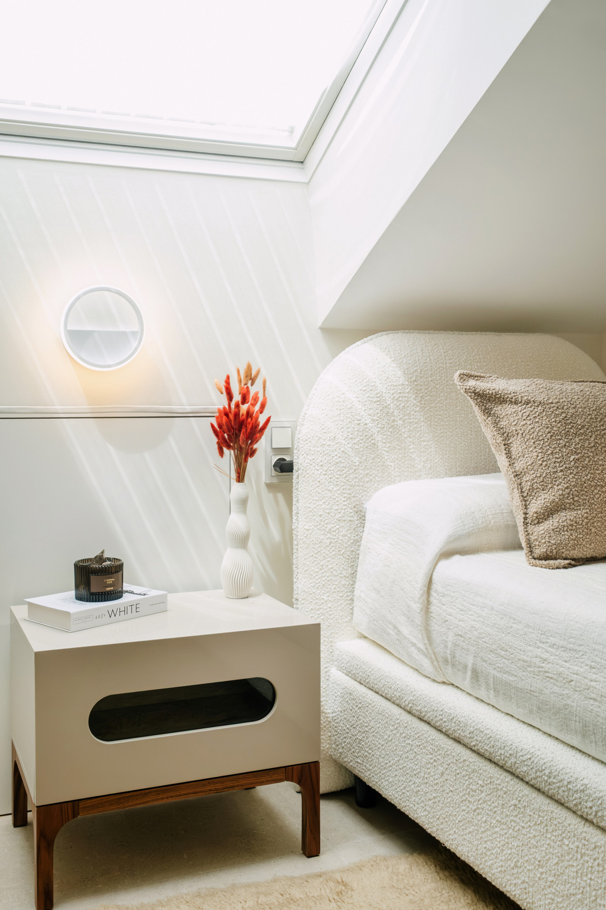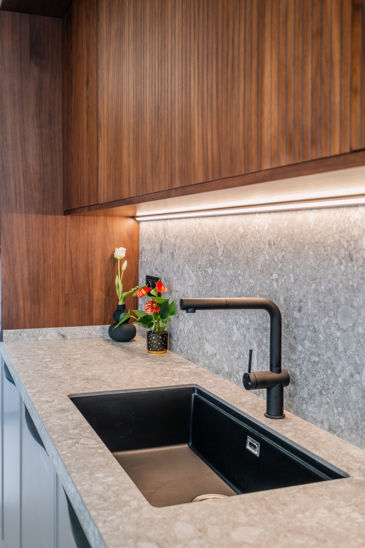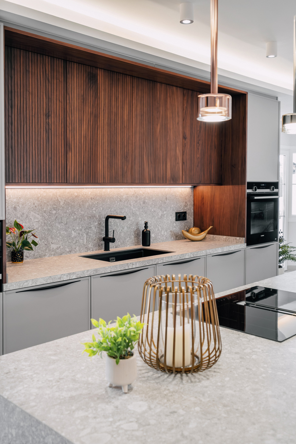The refurbishment, completed in 2025, combines natural materials, walnut wood details, and warm lighting to create a calm, modern interior. The main floor features an open-plan living and dining space with a well-equipped kitchen, including Siemens appliances, a stone island, double fridge, integrated wine cooler, and a separate butler's pantry.