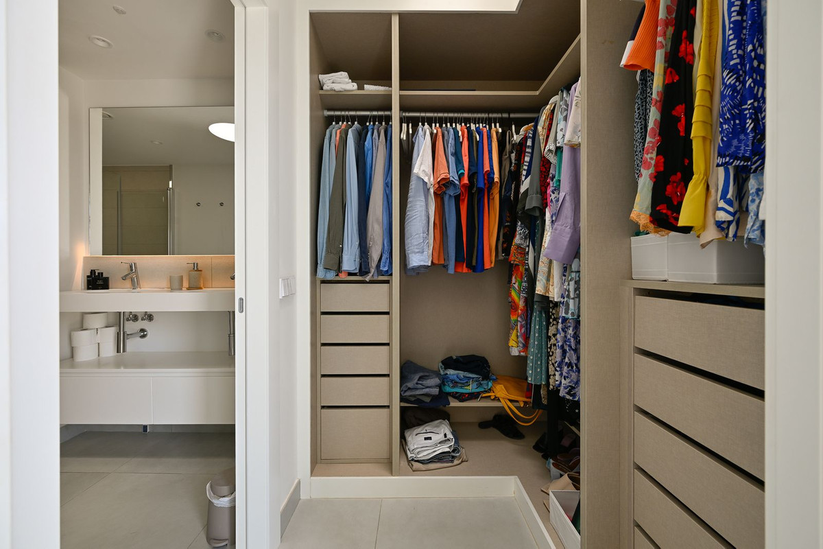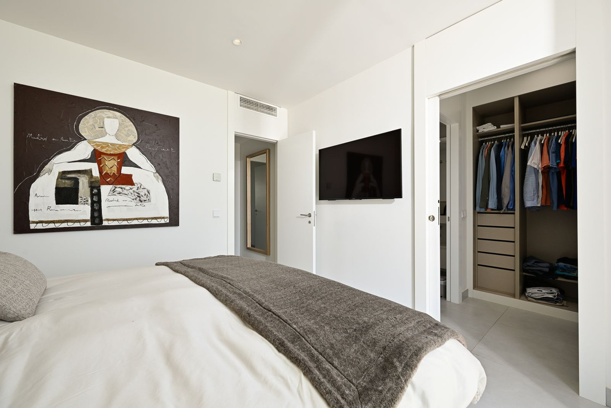 A private elevator from the garage whisks you directly to your front door, where a light-filled, open-plan living and dining space welcomes you. The sleek, fully equipped kitchen features premium appliances and a separate utility room for added convenience. Floor-to-ceiling glass doors lead onto an expansive terrace, where you can relax or entertain while enjoying open views of the manicured gardens, shimmering pools, and the Mediterranean Sea.