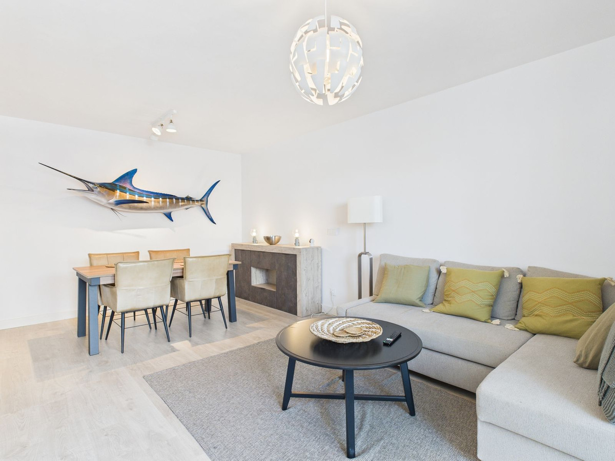Inside, the apartment boasts a generously sized living area, complemented by a separate, fully equipped modern kitchen.