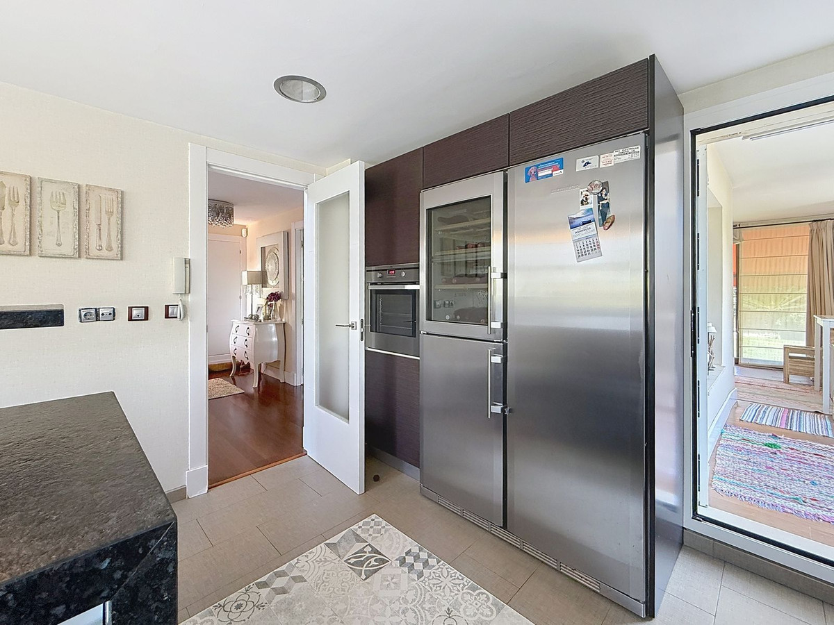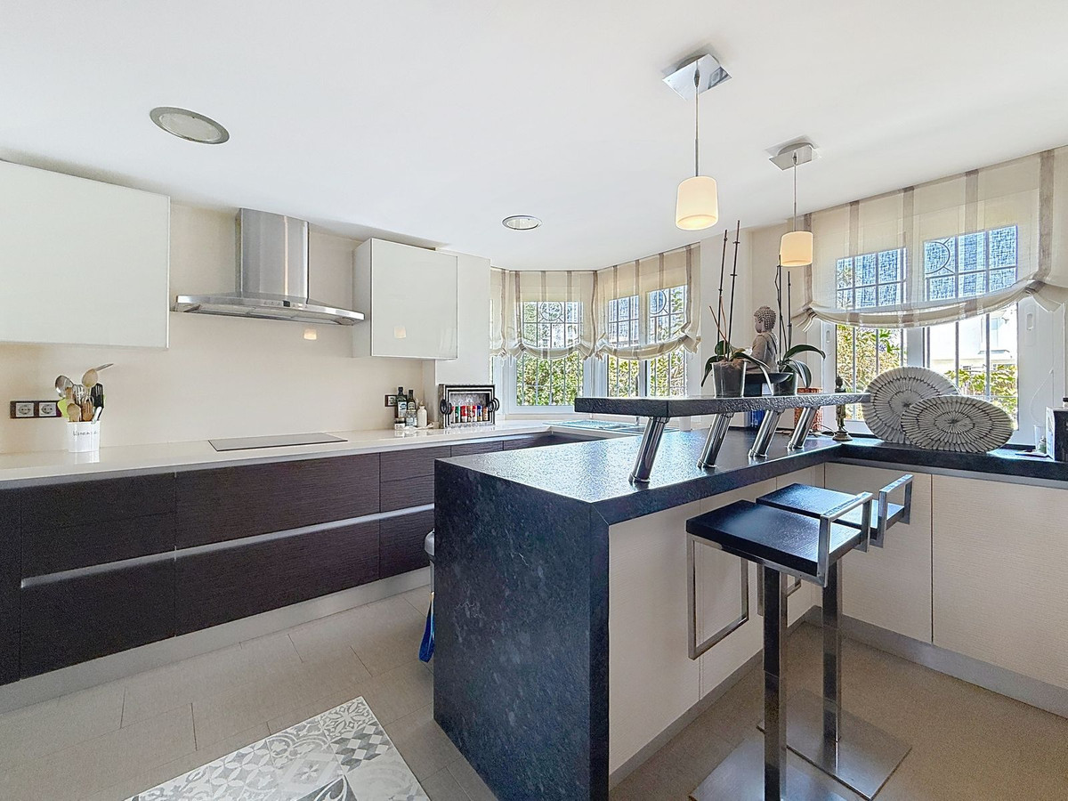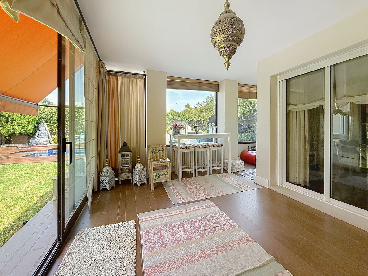 The villa welcomes you with a bright entrance hall and a separate guest toilet, before unfolding into elegant living spaces bathed in natural light. The lounge and dining area, with its inviting fireplace and graceful arched windows has views onto the beautiful gardens. The modern kitchen, finished with ceramic wood-look flooring, combines contemporary style with practical ease of maintenance.