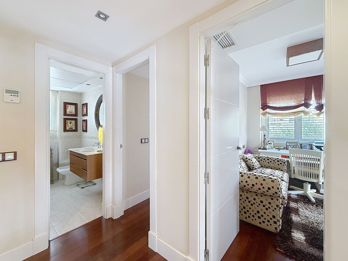 Upstairs, the night area offers three spacious bedrooms, including a tranquil master suite with en-suite bathroom. A second guest room with its own full bathroom, and a third bedroom currently used as an office, ensure comfort for family and visitors. An adjoining room – now used as dressing – can easily be converted into a fourth bedroom or private retreat.