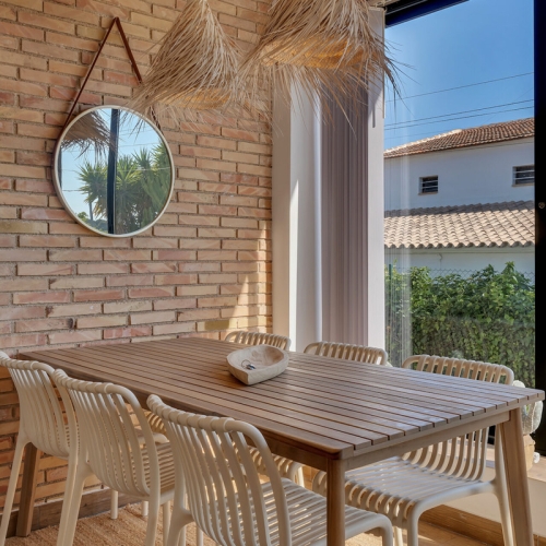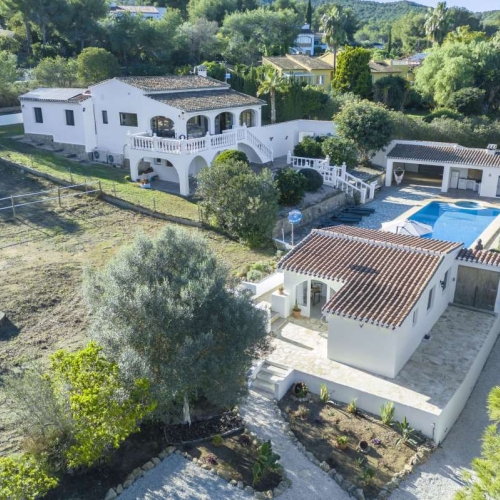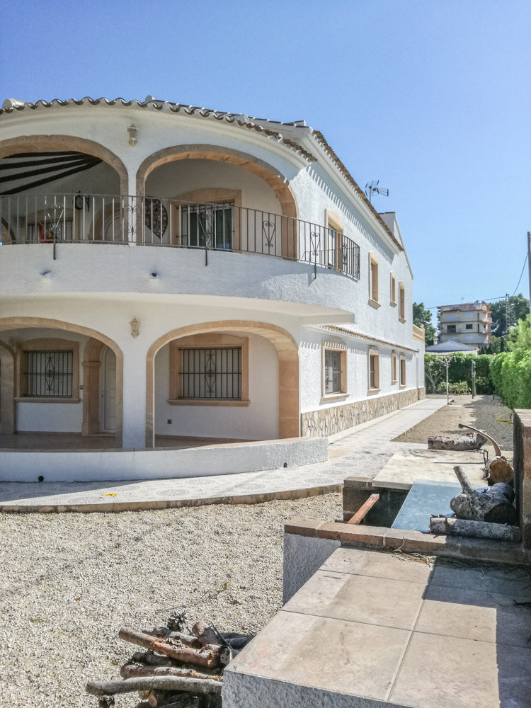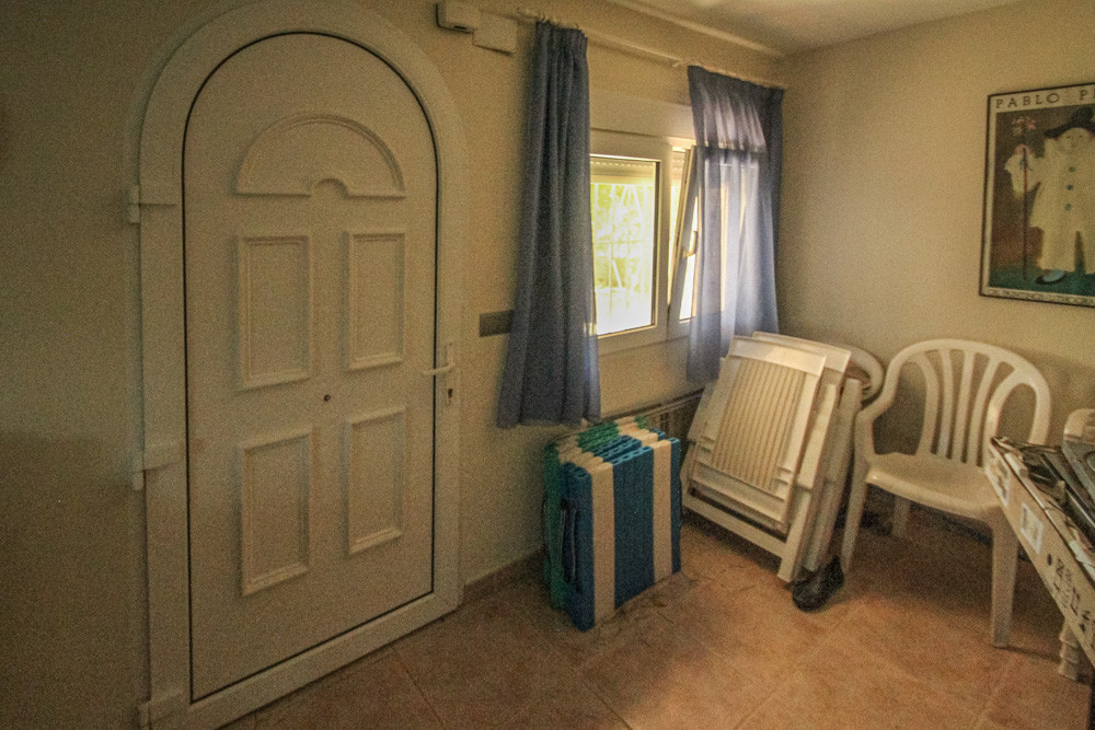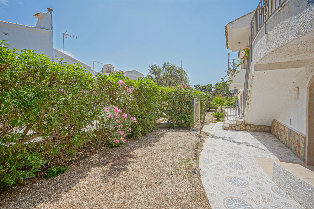 This large villa is located on a flat plot of 1144 m2 just 50 m from the beautiful beach of Cala Blanca. The villa is divided into two almost identical floors. The ground floor comprises a living-dining room, a kitchen, three double bedrooms, a bathroom and a covered terrace. The upper floor consists of a living-dining room, a kitchen, three double bedrooms, two bathrooms, a covered terrace and a large solarium of 40 m2 facing south. There is also a garage, a barbecue, an outdoor shower, two 16,000-litre water tanks for irrigation and access to a communal water source. The villa is surrounded by a Mediterranean garden, with plenty of space on both the south and north sides of the house. On the north side are several pine trees that, together with the cool sea breeze, ensure it is never too hot on the covered terrace. The south side, surrounded only by a bright flower hedge and a few fruit trees, is ideal for enjoying the sun in winter or for installing a swimming pool. The villa is less than a 1.5 km from the sandy beach and the Arenal promenade. There is a pharmacy and an international school 300 m away and a supermarket 500 m away. Just 100 m away is also a nice bar by the sea.