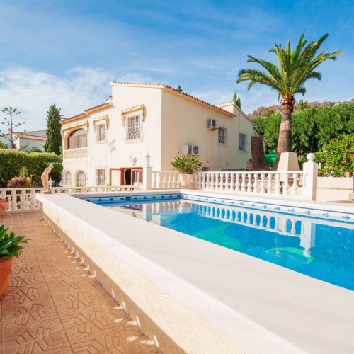 This traditional Spanish single storey villa is located in a quiet and green area and offers beautiful views over the countryside. The villa has a lounge with dining area, a fully equipped kitchen, 3 double bedrooms and a bathroom. In addition, there is a partly covered terrace with swimming pool. Because of the large plot there are several possibilities to further expand this villa.