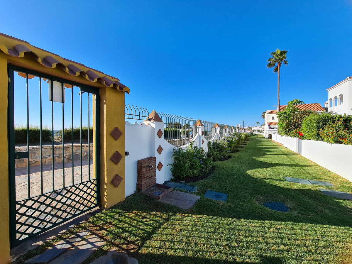 Excellently located in a beachfront development with access to the Coastal Path that connects the entire Costa del Sol, and the beach is just steps away. Close to supermarkets, shops, restaurants, and a wide variety of leisure options, Sabinillas is just a 2-minute drive away and Estepona is 10 minutes away, while Malaga Airport is a 90-minute drive away. The property is spread over two floors plus the solarium. On the ground floor, we find the main entrance with a spacious hall, a toilet with a window, a large kitchen with access to the rear terrace, and a large living-dining room with a fireplace and access to a porch that connects to the large private garden. The first floor houses the house's three bedrooms, each with its own private terrace and built-in wardrobes. It also has a spacious full bathroom equipped with a bathtub and a large window. The master bedroom has an en-suite bathroom equipped with a bathtub and a large window, as well as a beautiful private covered terrace. On the upper floor, we have a turret, a storage room, and a large solarium with views of the sea, gardens, and the pool. This well-maintained complex offers swimming pools, gardens, and beach access. A GREAT OPPORTUNITY TO EXPERIENCE THE LUXURY OF HAVING YOUR OWN HOME JUST STEPS FROM THE SEA!