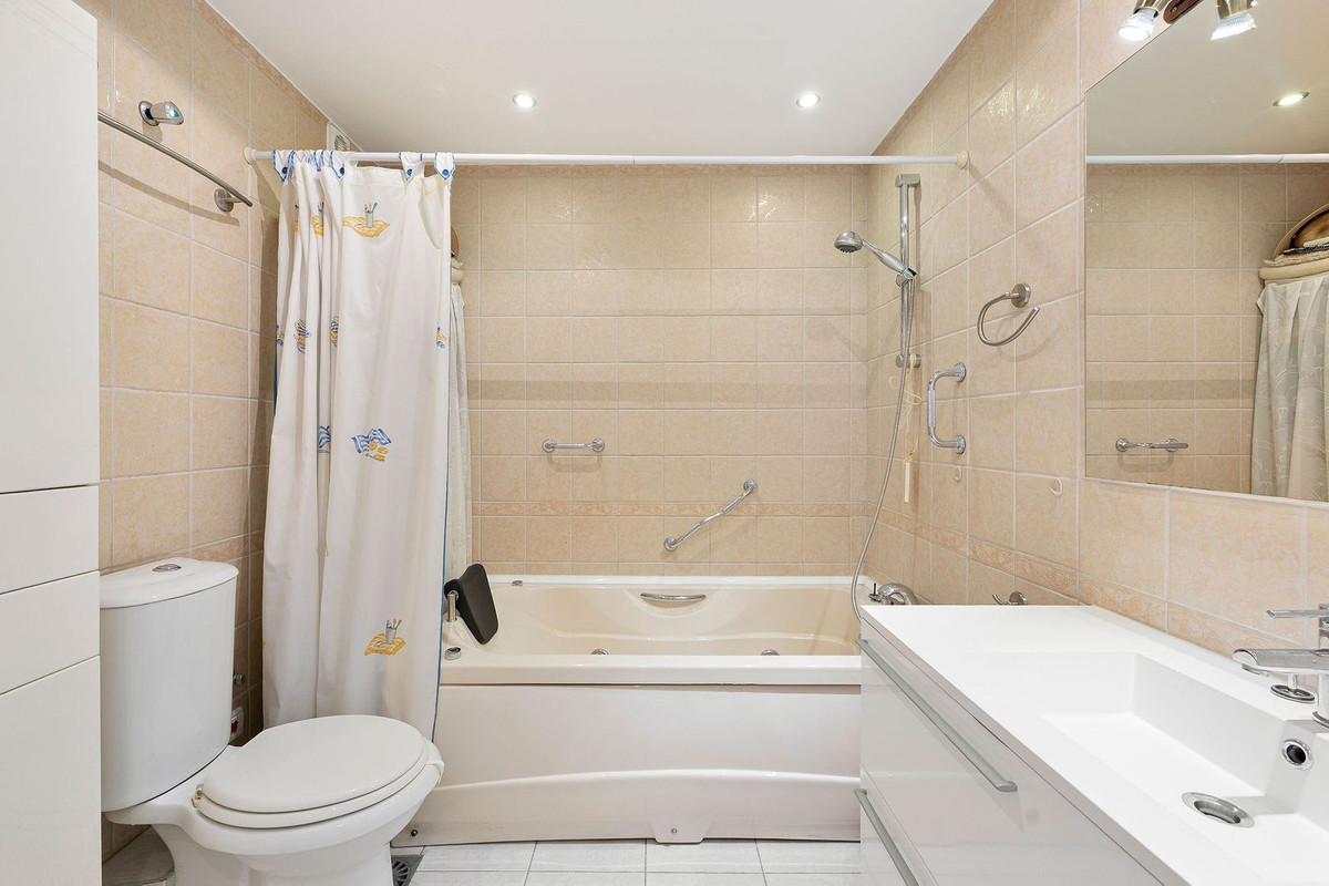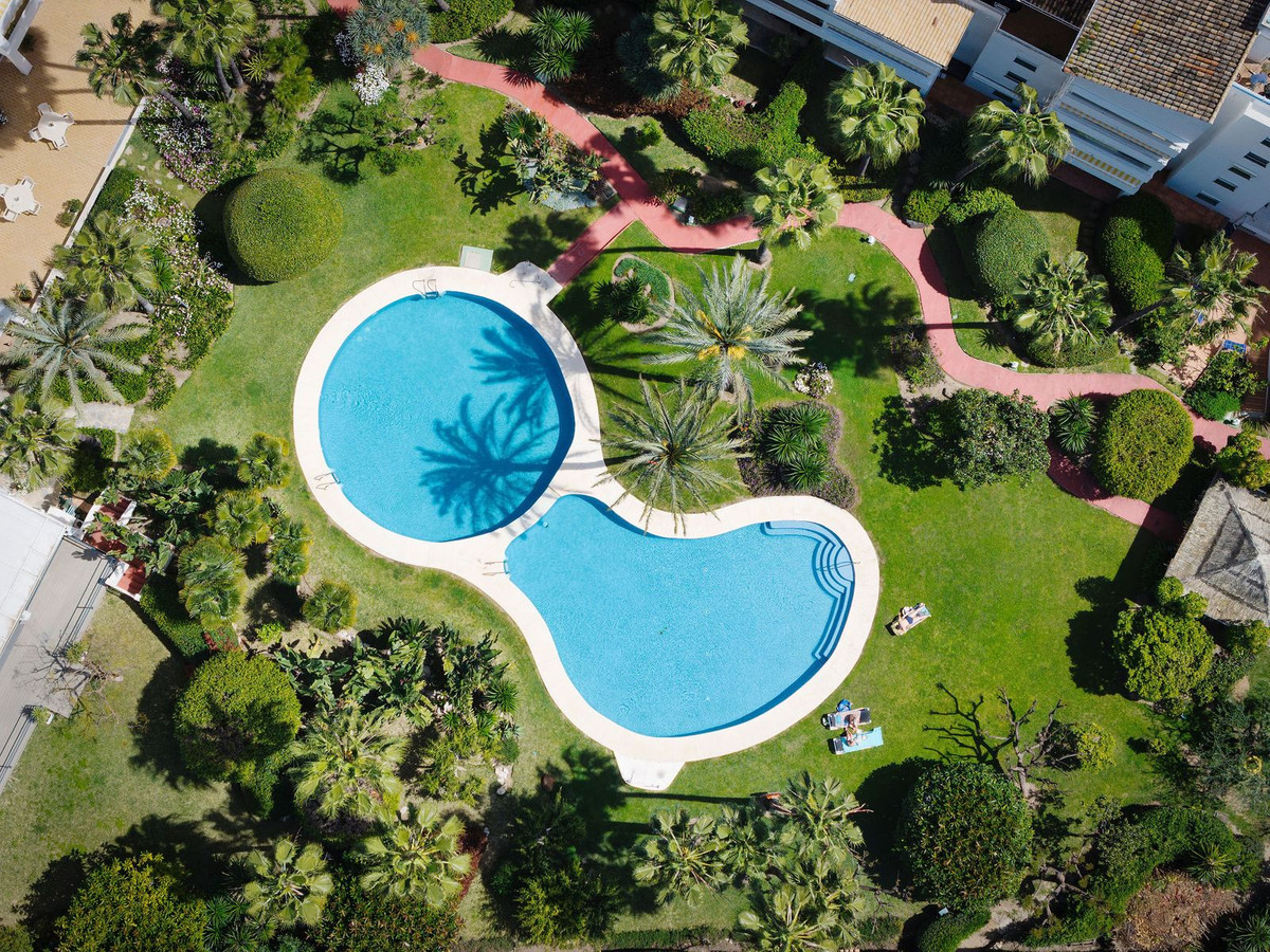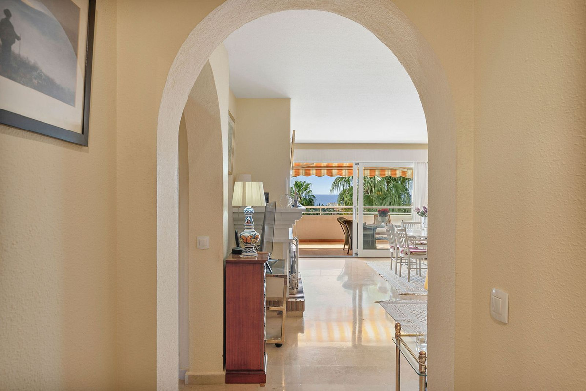 Top floor apartment in the popular complex of Nordic Royal Club. Situated on the 5th floor gives the apartment beautiful views over the well kept garden towards the sea. There are 2 well sized bedrooms and 2 bathrooms. The lounge area and master room opens up towards the glassed in terrace. The urbanisation has a 24 hr reception ensuring good security and peace of mind. The apartment comes with an underground parking and storage room. From the parking there is access to the apartment floor by the elevator. Hot and cold water are included in the community fee.