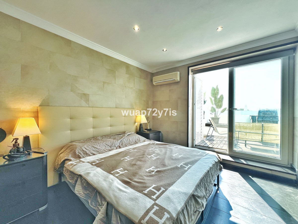 This beautifully renovated penthouse is located in the sought-after Sun Gardens urbanization in Estepona East. The community offers a swimming pool and permits short-term rentals, making it an excellent investment as well as a wonderful home. Upon entering, you are welcomed by an entrance hall with access to a guest toilet. To the right, there is a bright open-plan living room with a fully equipped kitchen. From the living area, you step out onto a spacious terrace with a barbecue area — perfect for dining and entertaining. From this terrace, a staircase leads you up to the private rooftop terrace, where you can relax in the jacuzzi, enjoy the additional barbecue space, and take in breathtaking panoramic views of La Concha mountain and the Mediterranean Sea.
