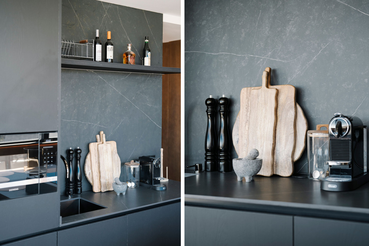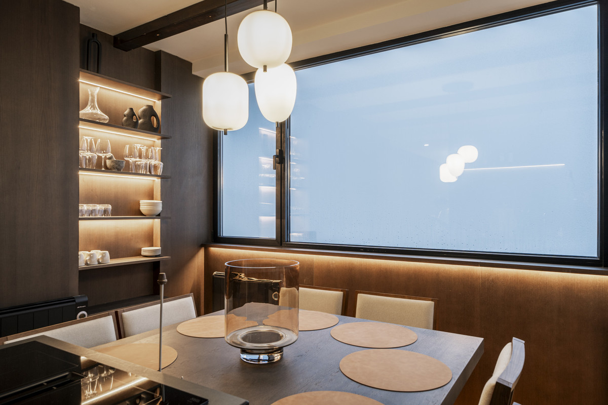 The open-plan kitchen and living area are custom-designed and equipped with Siemens appliances. A central island includes a cooktop and bar seating, while an ethanol fireplace enhances warmth and ambiance. Panoramic windows frame mountain views and maximise natural light throughout the living space.
