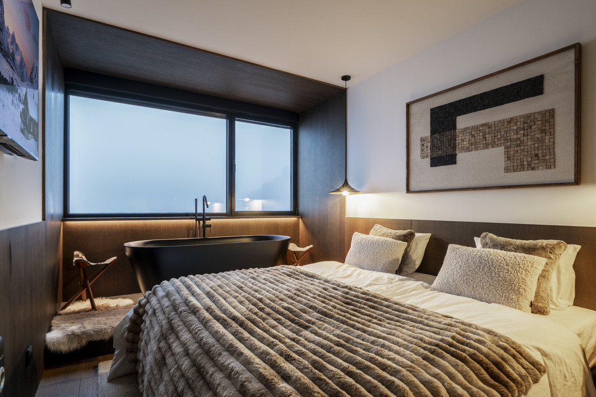 The property includes two bedrooms with mountain views, two full bathrooms (one featuring a custom sauna), and a guest WC. The master suite benefits from direct mountain-facing views, an en-suite bathroom, and a freestanding bathtub positioned to take in the scenery.