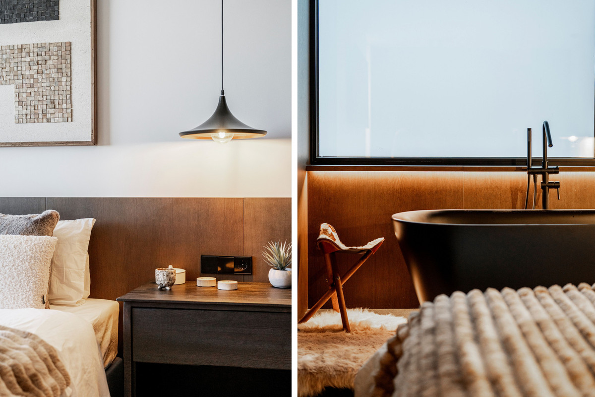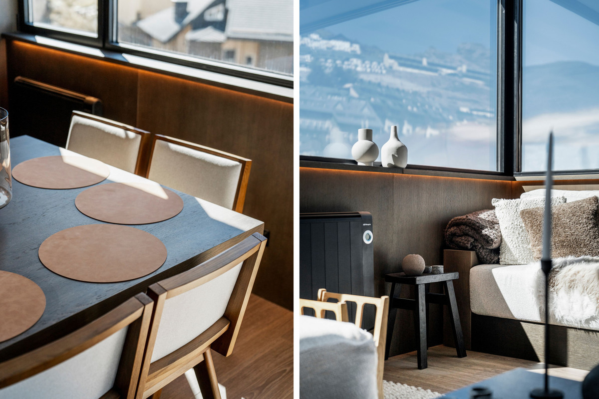 Additional features include towel warmers in all bathrooms, radiator heating throughout, high-quality finishes, and Scandinavian-inspired design elements such as woven rugs, candles, and faux-fur textiles. The property includes private garage parking and is located just steps from the renewed El Lodge Hotel and direct ski lift access.