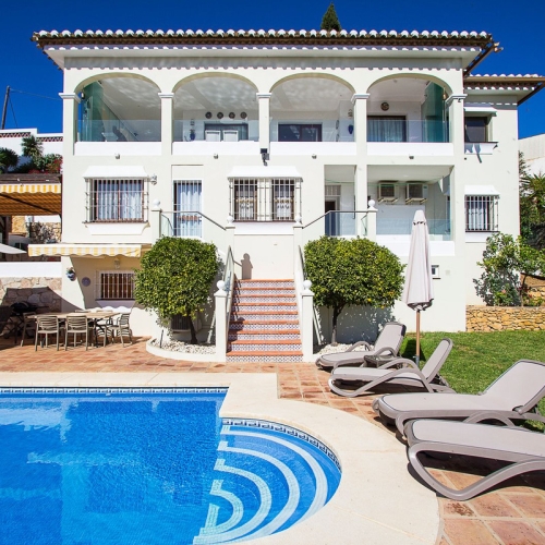 Spectacular villa that perfectly blends Mediterranean style with contemporary design, combining traditional charm with modern comfort and top-quality finishes. Located in the prestigious Buena Vista area of Mijas, it offers a unique lifestyle in a peaceful and private setting, with stunning panoramic views of the Mediterranean Sea, the coastline, Africa, and the mountains. Set on a plot of 800 m² with a built area of 251 m², the property is in immaculate condition and ready to move into. Its location is unbeatable: just 5 minutes from Fuengirola, 2 minutes from the exclusive Higuerón commercial area with all kinds of services, 10 minutes from the finest beaches of the Costa del Sol, and only 20 minutes from Málaga city center and the airport. The villa is mainly distributed on one floor, ensuring functionality and comfort. Upon entering, the home immediately stands out for its brightness and sense of space thanks to the open-plan design. The modern fully fitted kitchen seamlessly integrates with the spacious living room with fireplace, creating a warm atmosphere that connects with the terraces and garden through large sliding doors. The exterior is a true private retreat, featuring a swimming pool with sunbathing area and hydromassage jet, a barbecue area ideal for outdoor gatherings, and a landscaped garden with fruit trees, all with open views to the sea and mountains. The property offers four bedrooms. The master bedroom, with en-suite bathroom and walk-in wardrobe, has direct access to a terrace with a private jacuzzi. Two additional bedrooms with their own bathrooms are located on the opposite wing of the house, ensuring privacy for family or guests. On the upper floor, a versatile space currently used as a gym with bathroom and private terrace can easily be converted into an independent suite with spectacular views. Additional features include a cinema room, sauna, laundry room, air conditioning, solar panels for hot water, and parking space for three vehicles, including a closed garage and covered carport. An ideal residence both for year-round living and as a luxury holiday home, perfect for those seeking privacy, comfort, and a strategic location on the Costa del Sol.