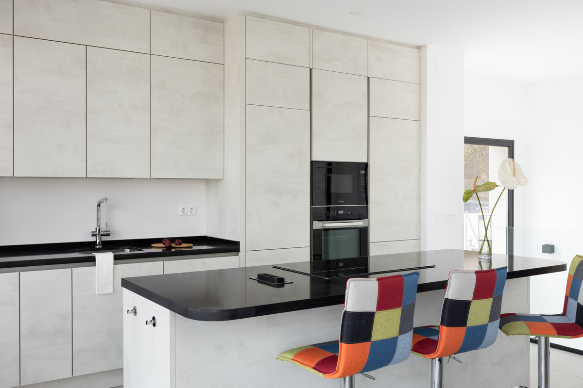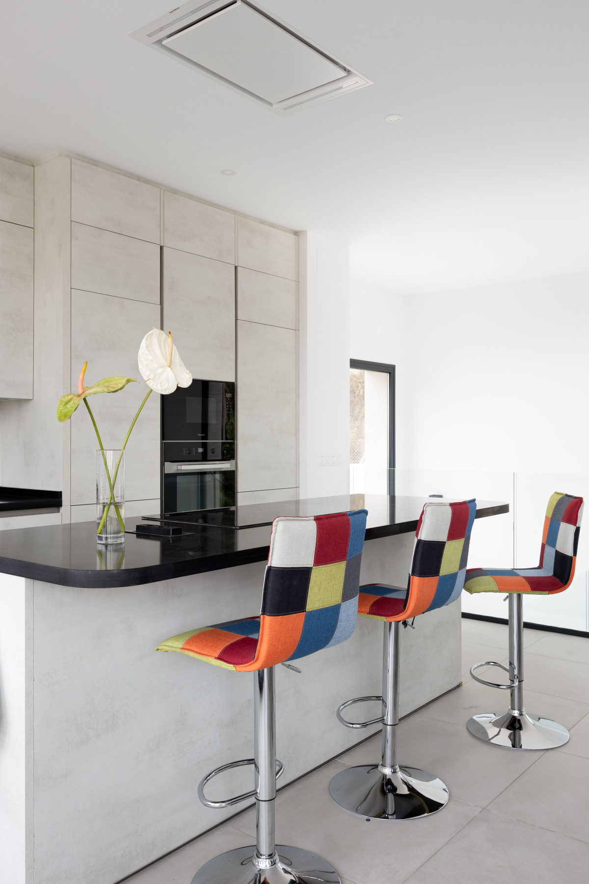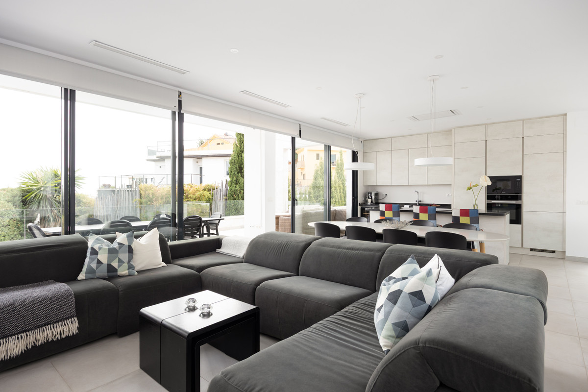 On the ground floor, you will find three spacious bedrooms, all with direct access to the terrace and pool area. The master bedroom features a luxurious en-suite bathroom and a generous walk-in closet. The upper floor impresses with an open-plan design, a state-of-the-art kitchen of the highest standard, and a bright living room. From here, you can access the large terrace, perfect for social gatherings with a dining area, lounge space, and barbecue, as well as partial sea views.