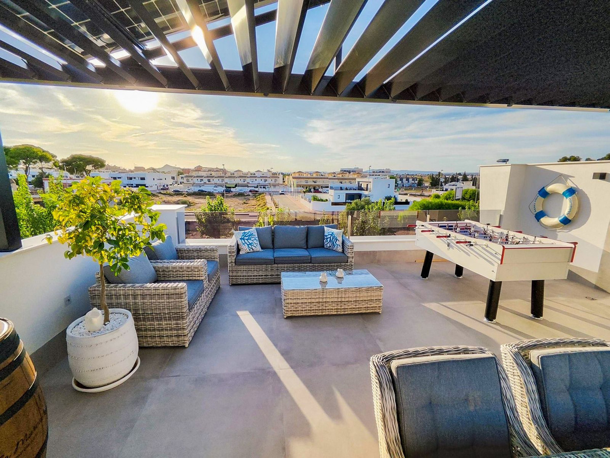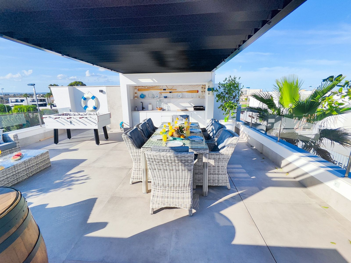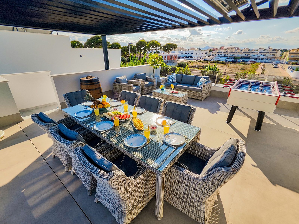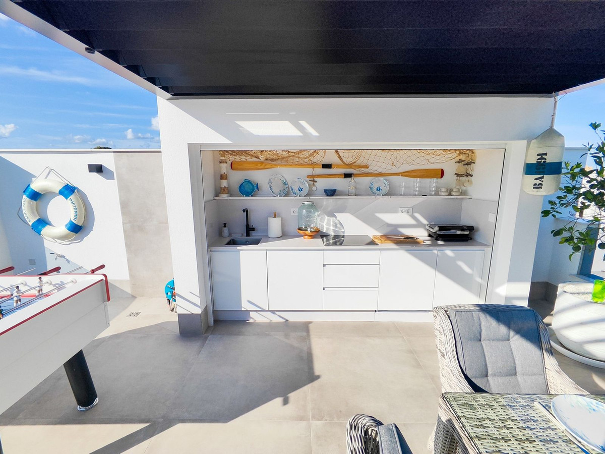This villa offers everything you could desire and more, featuring three bedrooms with fitted wardrobes and private terraces, three bathrooms with underfloor heating, a spacious living/dining area, and a fully fitted kitchen. The property is bathed in natural light, with sliding patio doors providing direct access to private gardens, terraced areas, and a private swimming pool. Additional benefits include a garage, utility area, electric blinds, a roof solarium with a pergola, an outdoor kitchen, and a smart lock system with a fingerprint sensor.